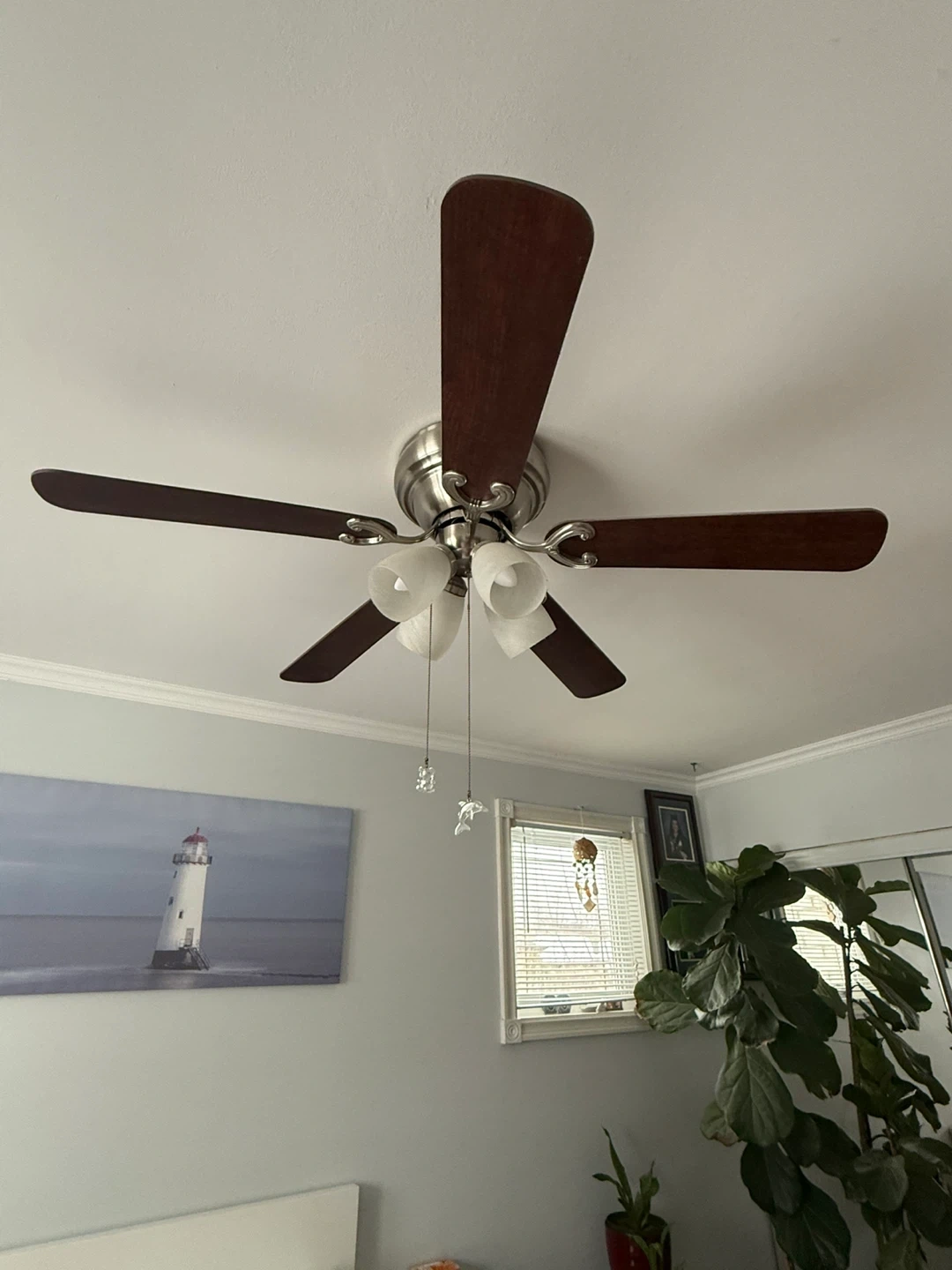 Five-blade ceiling fan with lights. Wood-look blades and brushed nickel finish. Includes pull chains for fan and light control.