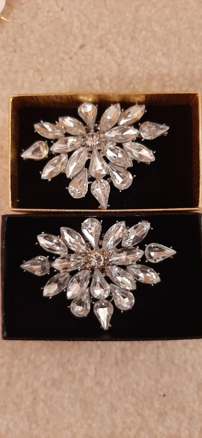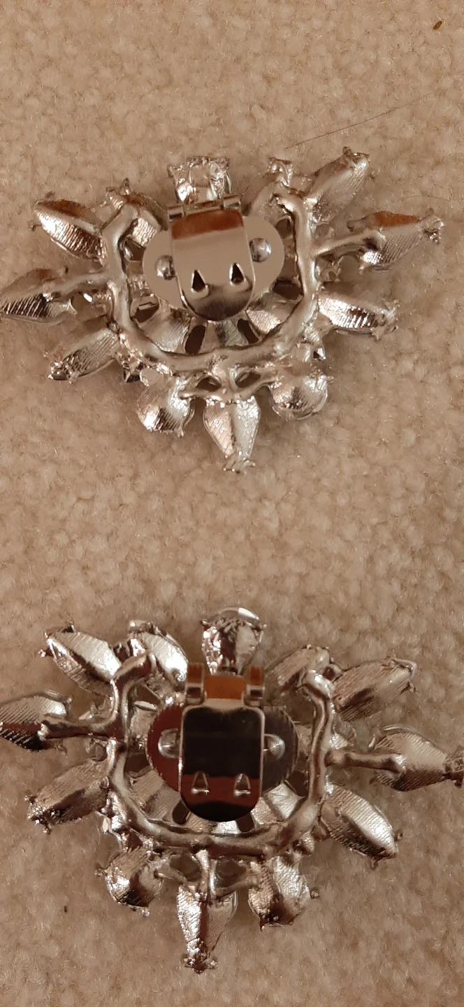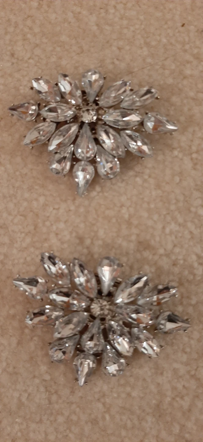A pair of decorative shoe clips featuring a floral design with clear rhinestones. They attach with a metal clasp. Great for adding sparkle to shoes!-New