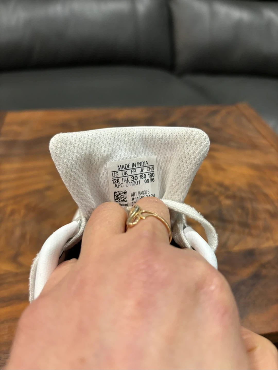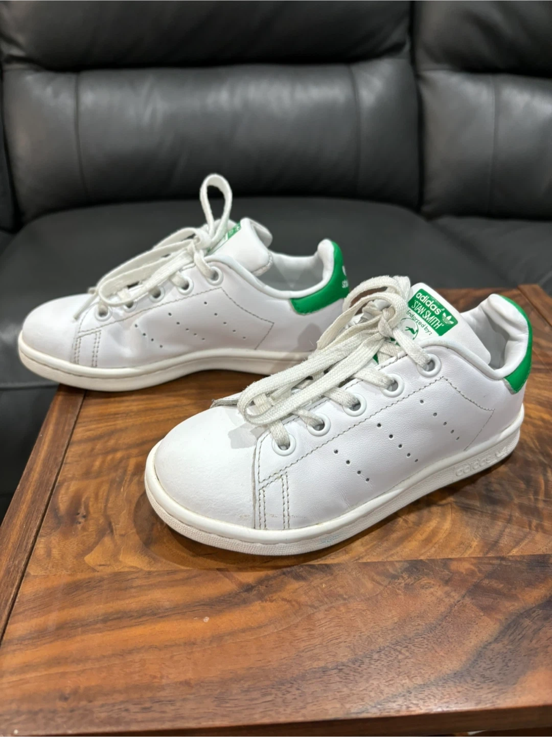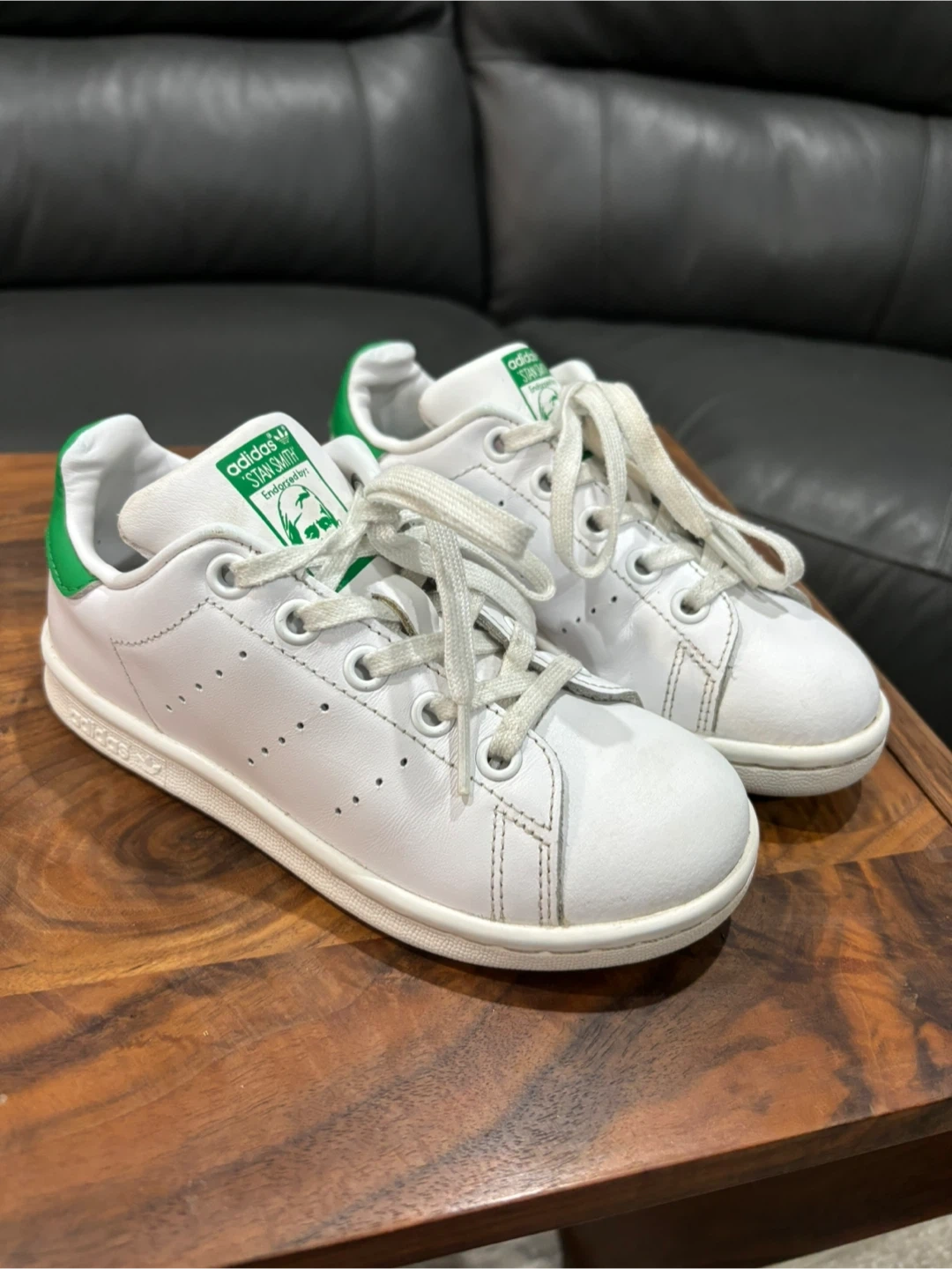 Selling a pair of Adidas Stan Smith sneakers for toddlers in size 11. The shoes are white with green accents. Size is US 12K, UK 11 1/2K, FR 30, CHN 180. Perfect for your little one!