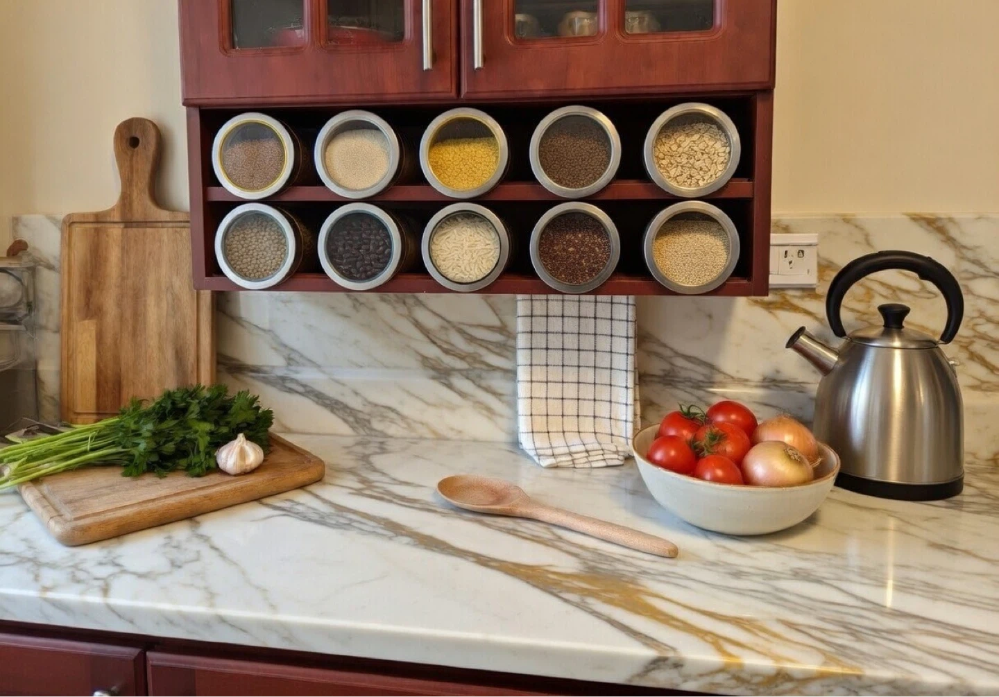10 glass canisters jars with metal lids for kitchen storage. Some lids have coloured accents. These are great for organizing spices, grains, daals, pasta, or other dry goods.