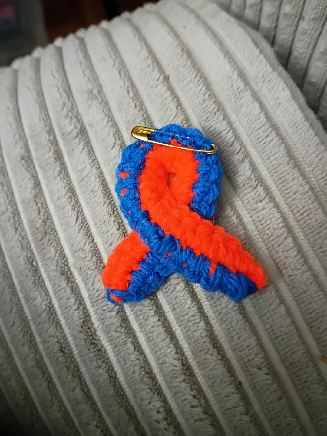 This is a handmade crochet ribbon pin with blue and orange colours. It's attached with a safety pin, ready to be worn. It's great for showing support or raising awareness for Functional Neurological Disorder. April is FND Awareness month. I have crocheted these ribbons to fundraise for FND Hope, fndhope.org.
