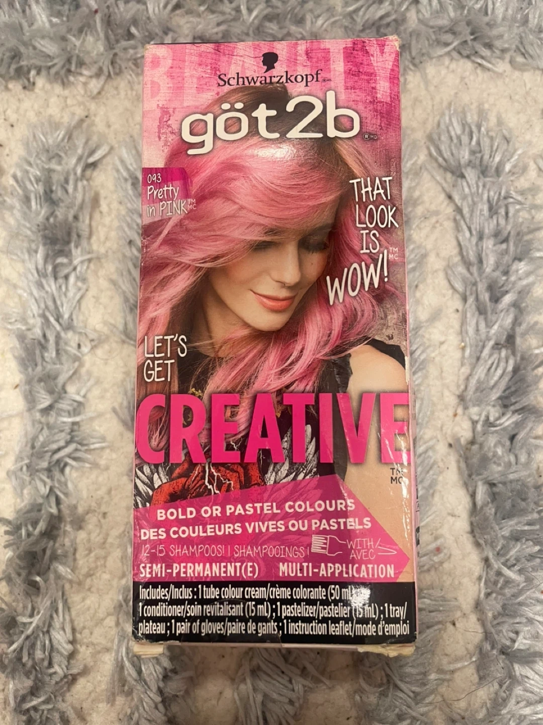 This is a Schwarzkopf got2b Colorista semi-permanent hair colour in the shade 'Pretty in Pink'. It's designed for bold or pastel colours and lasts approximately 12-15 shampoos. The kit includes one tube of colour cream (50 ml), one revitalizer (15 ml), one pasteurizer (15 ml), one tray, one pair of gloves, and one instruction leaflet. It's great for experimenting with creative hair colours!