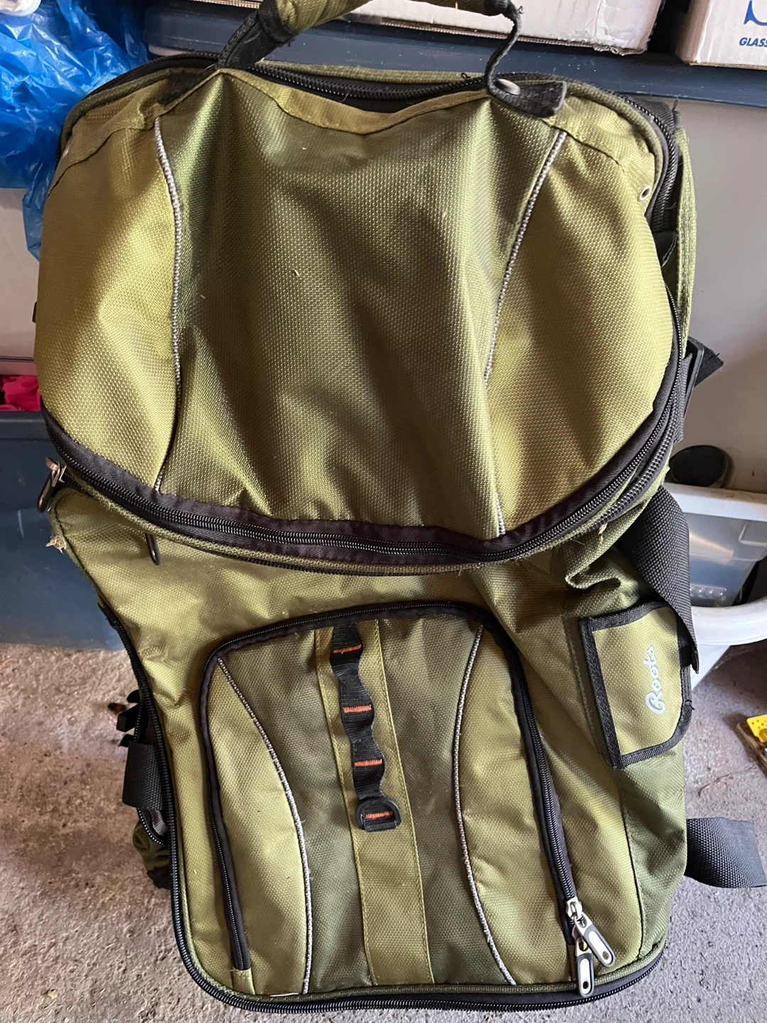 Looking to sell my Roots rolling backpack! It's a great bag for travel or school, with a retractable handle and wheels. The backpack is in good condition and ready for its next adventure. It's a stylish green colour!