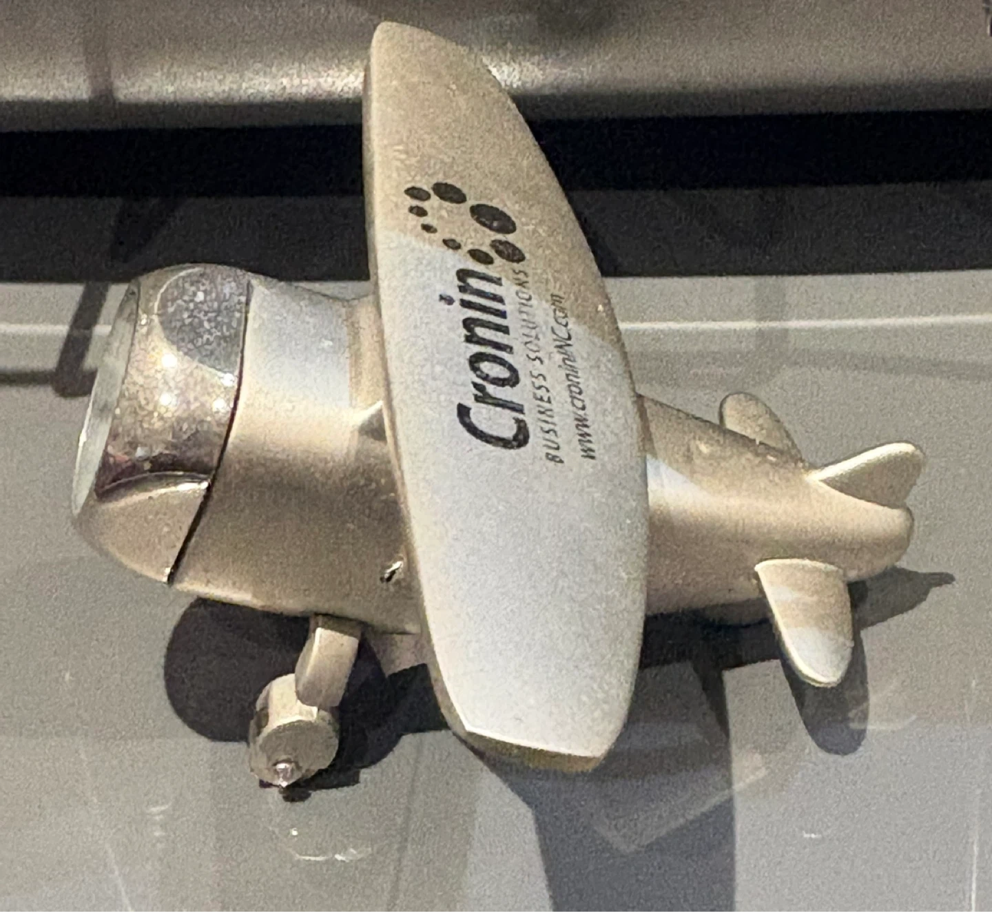 This is a novelty desk clock shaped like an airplane. It features a quartz movement and a silver-tone finish. It's a fun piece for any desk! Was from a Tradeshow gift - needs a new battery