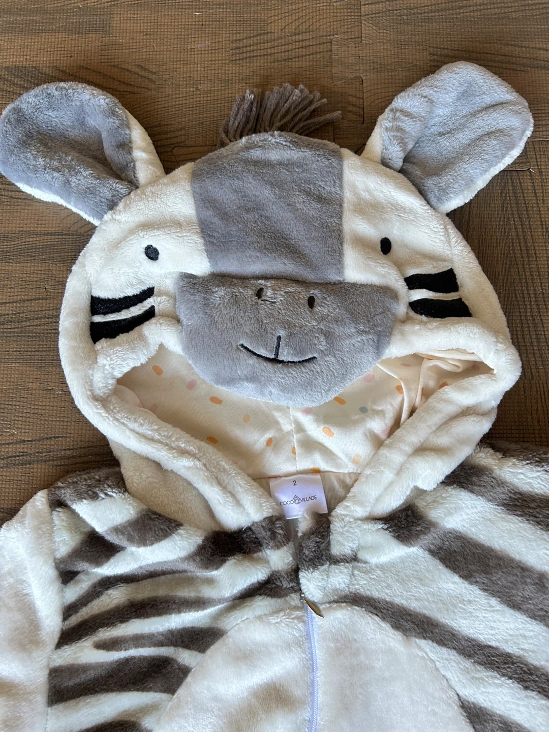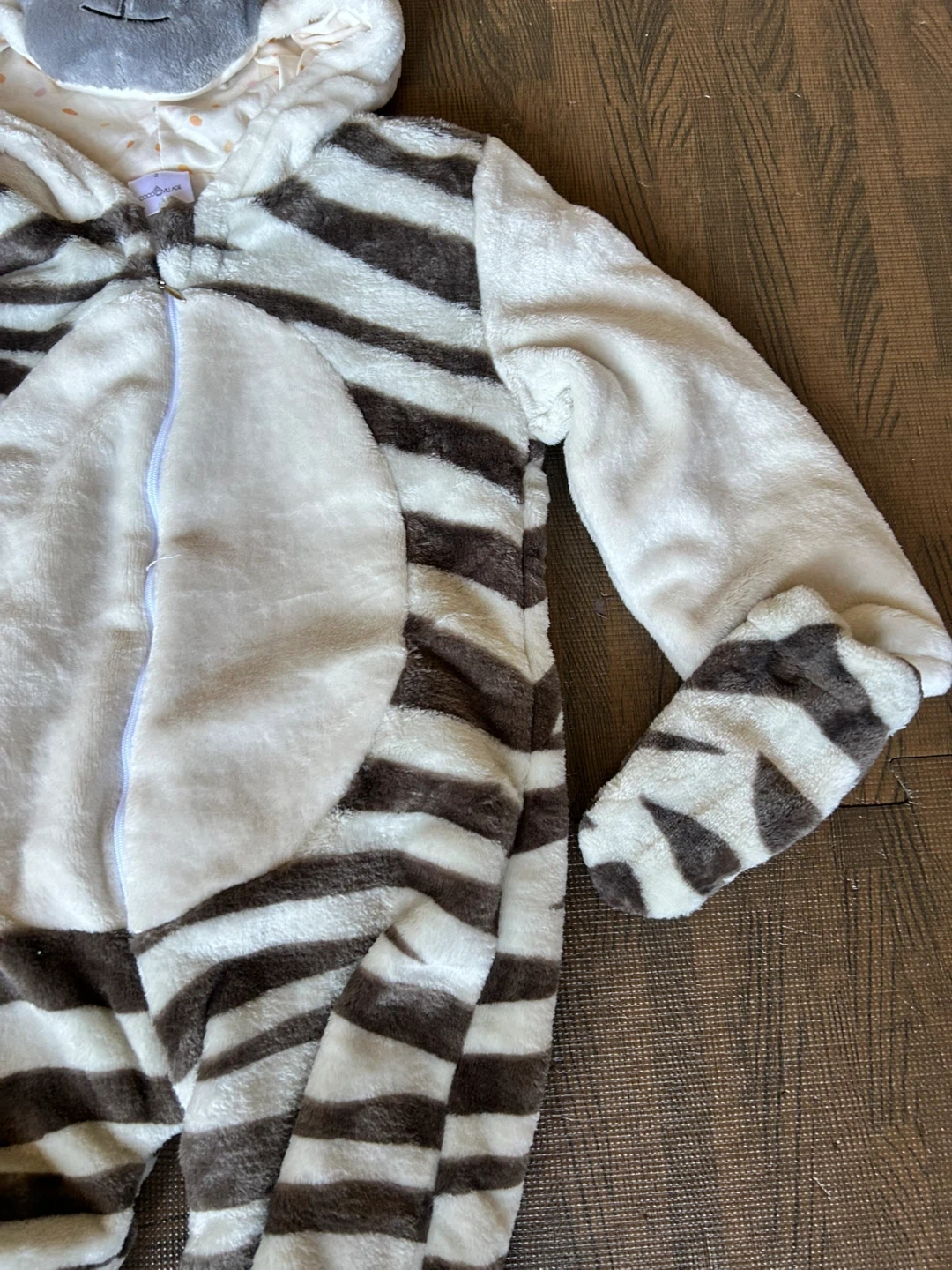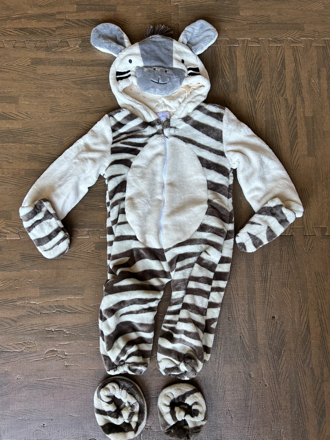 Cozy and cute zebra costume dress up with a hood and attached tail. Comes with matching footies. Size 2. Runs big. Never worn.