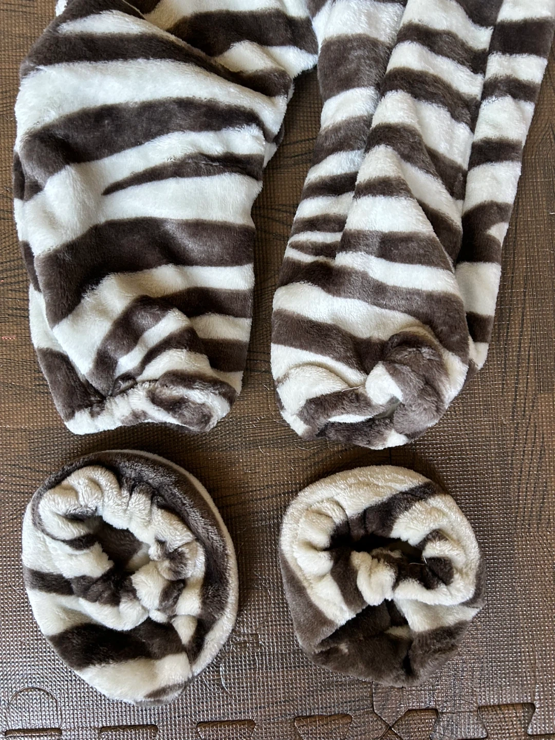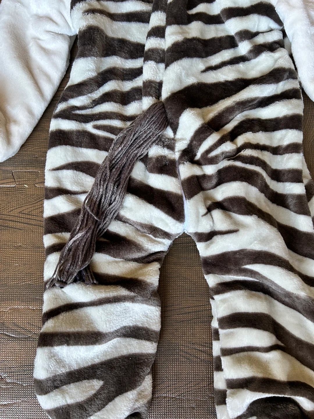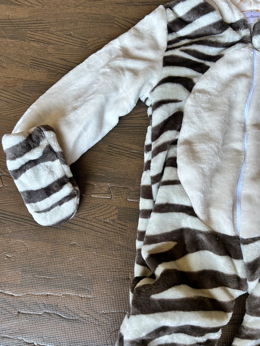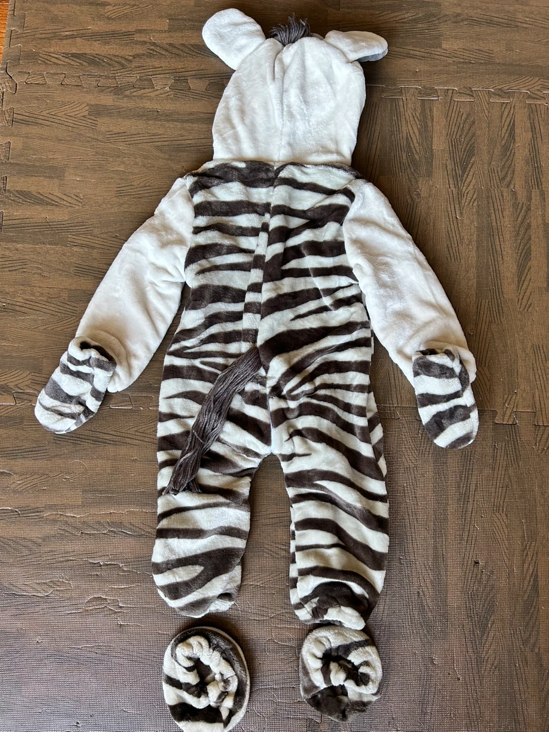 Cozy and cute zebra costume dress up with a hood and attached tail. Comes with matching footies. Size 2. Runs big. Never worn.
