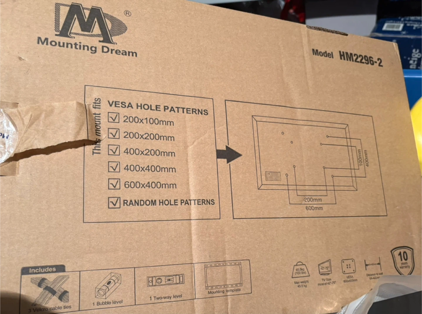 This is a Mounting Dream Full-Motion TV Wall Mount, model HM2296-2. It's designed for various VESA hole patterns up to 600x400mm. The mount supports a maximum weight of 45 kg (100 lbs) and fits TVs from 42" to 70". It includes 3 Velcro cable ties, a bubble level, and a mounting template.