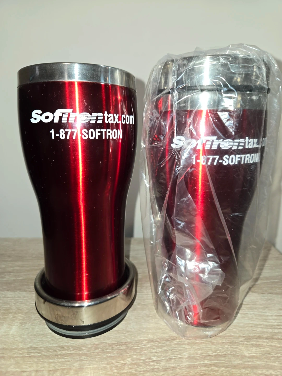 Two red metal travel tumblers, both featuring the Soffrontax.com logo and 1-877-SOFFRON. One tumbler is in its original plastic packaging. These tumblers are great for keeping beverages hot or cold on the go!