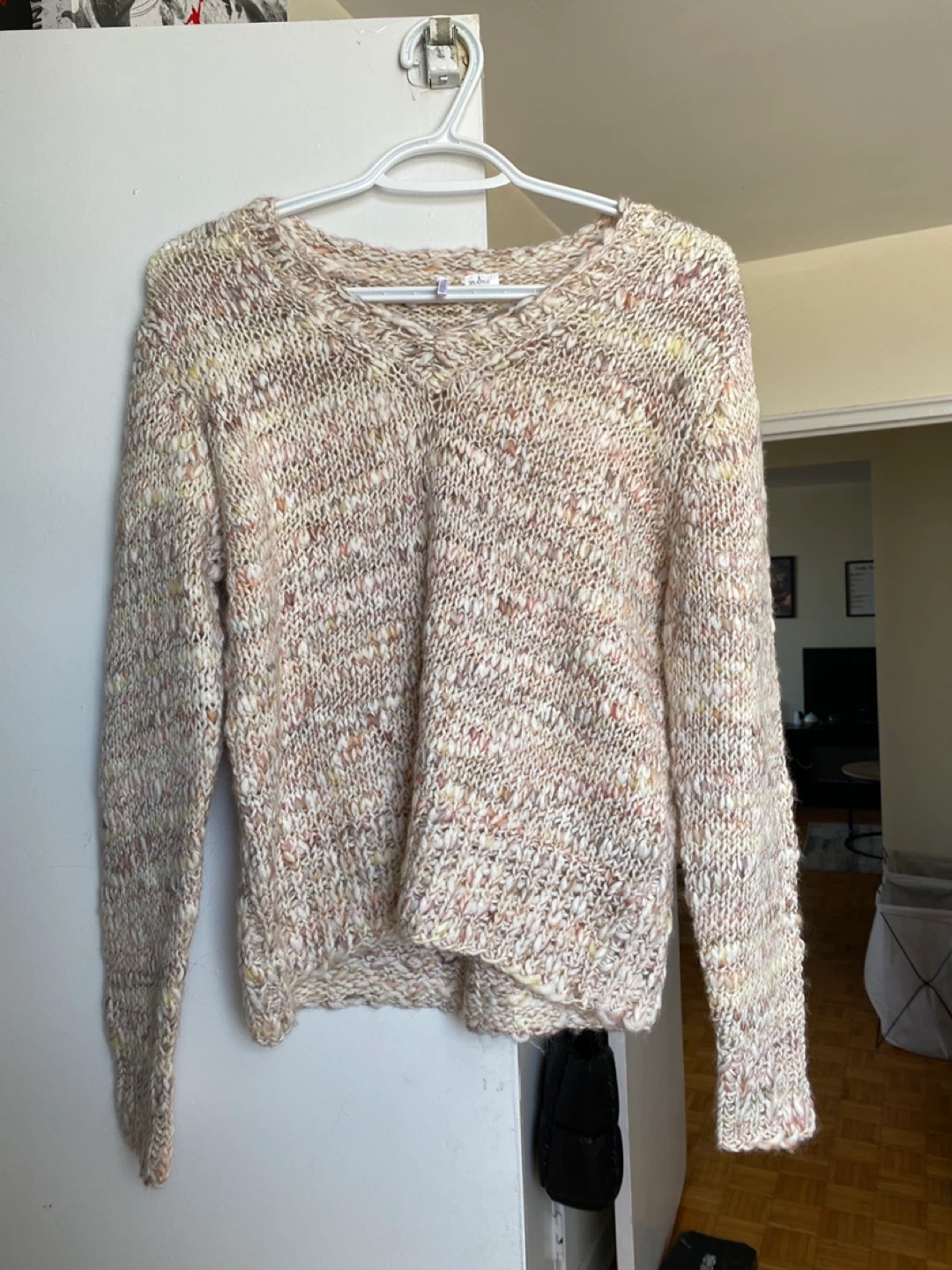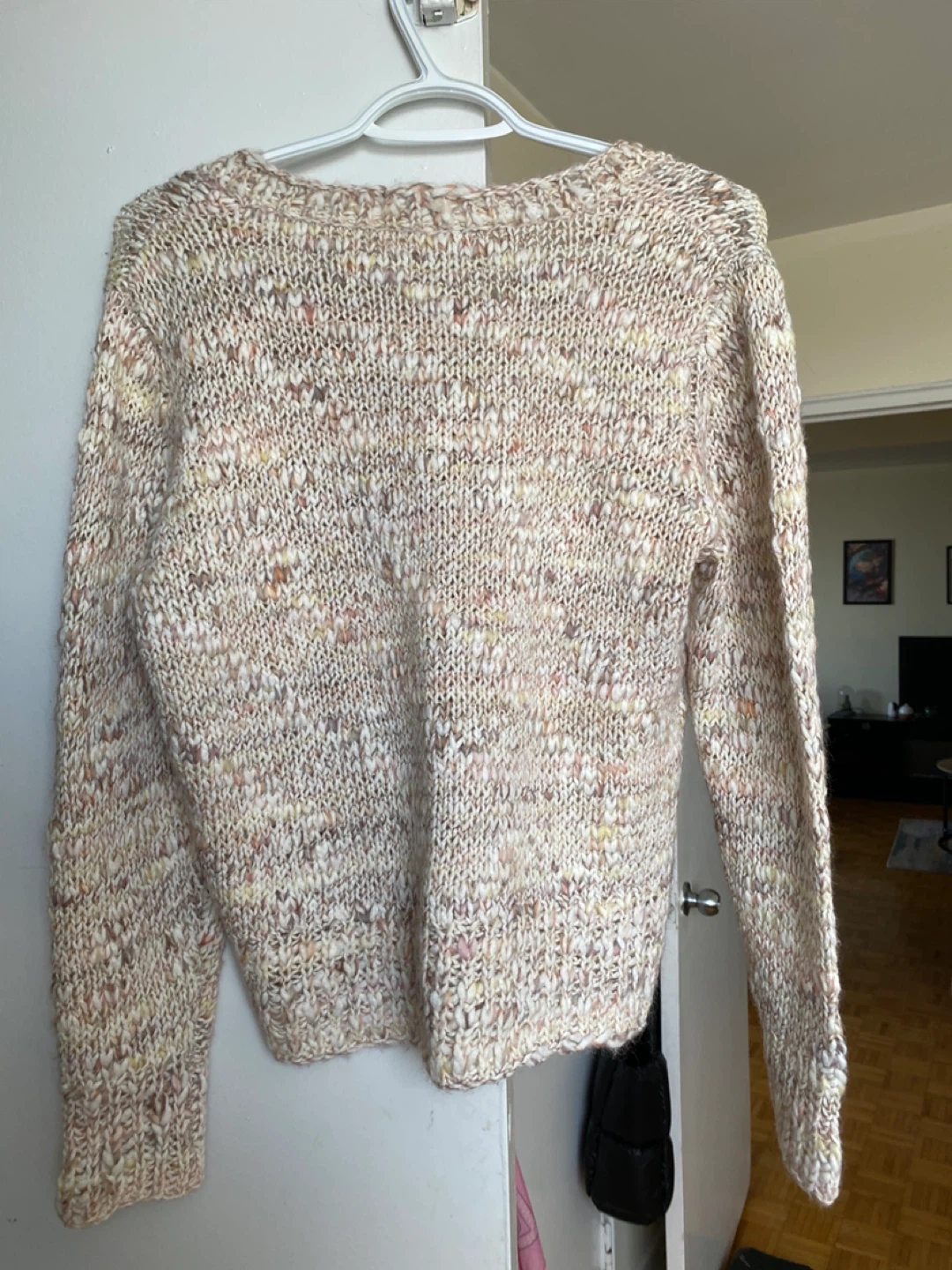 Selling a cozy knitted sweater in a size small! It's a lovely blend of colours, perfect for adding some warmth and style to your wardrobe. The material is soft and comfortable, making it ideal for those cooler days. It's in great condition and ready for a new home!