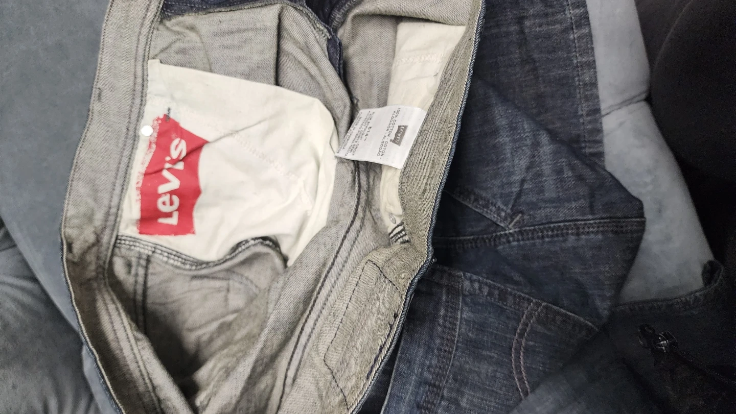These are Levi's 514 jeans in a slim straight fit. They're made of 100% cotton and are a size 34 waist by 34 inseam. A staple for any wardrobe!