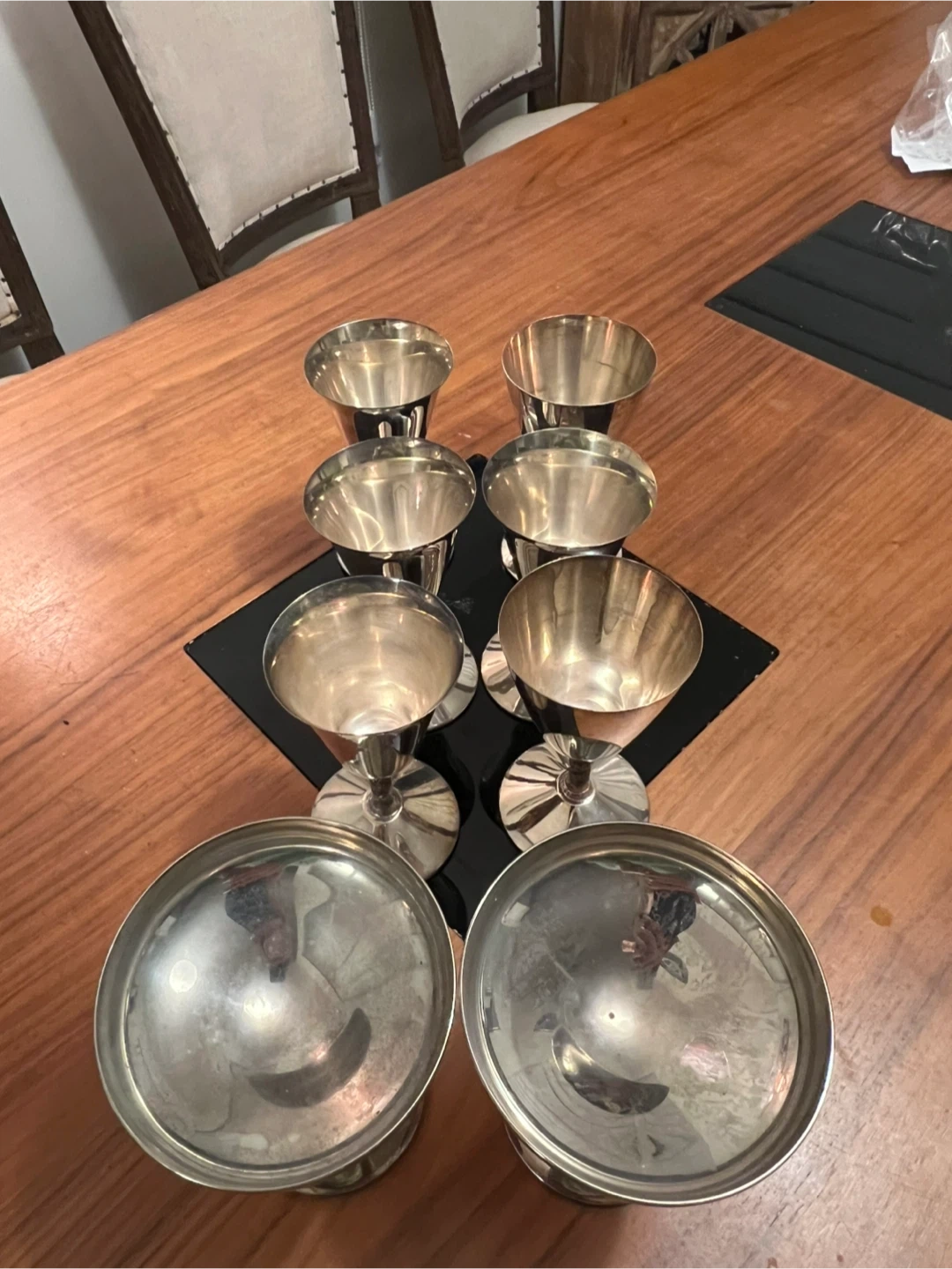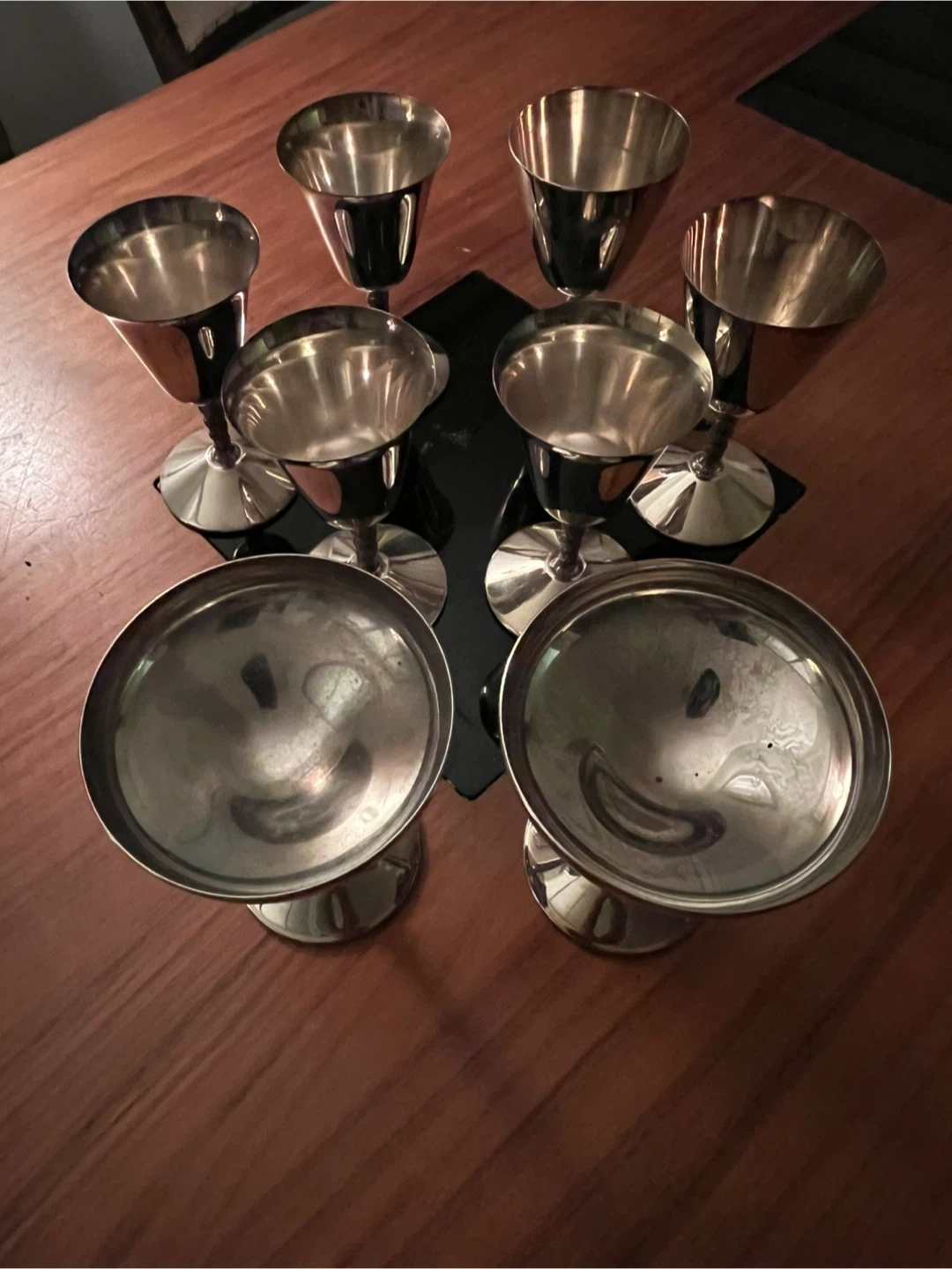 Eight gleaming silver footed goblets are ready for your next gathering. These versatile cups would be perfect for serving individual desserts or as unique drinkware. They're made of metal and have a polished finish.