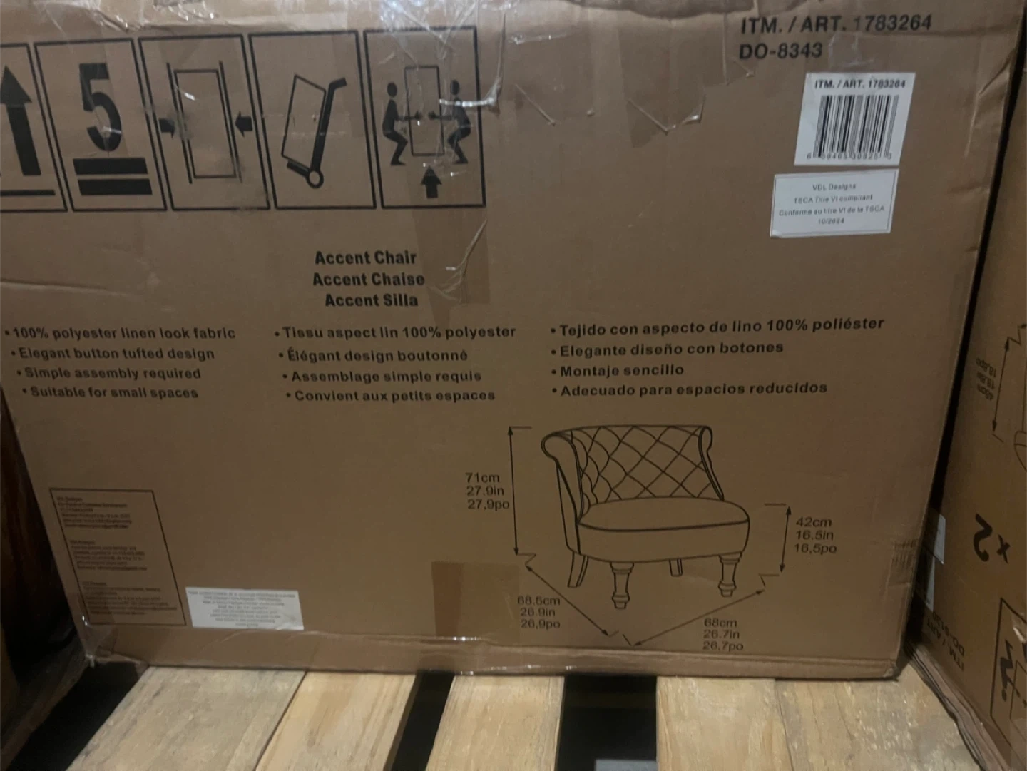 Accent chair upholstered in 100% polyester linen look fabric. Features elegant button tufted design and simple assembly. Dimensions: 71cm height, 68.6cm width, 42cm depth. Suitable for small spaces!