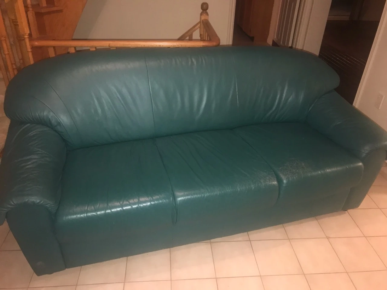 This is a green leather sofa. It has three seat cushions. Some wear is visible on the front cushions.
