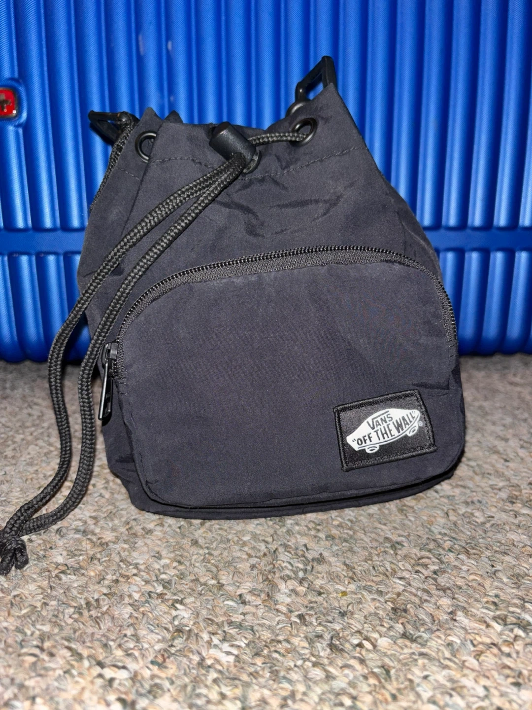 This black Vans bucket bag has a drawstring closure and a front zip pocket. It's made from nylon material and includes a detachable shoulder strap. Great for carrying your essentials!