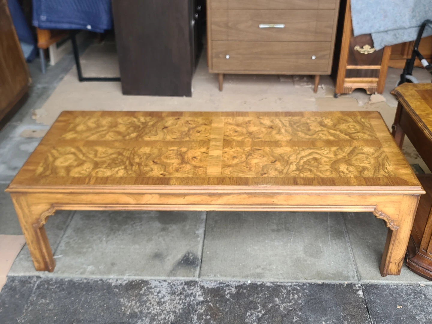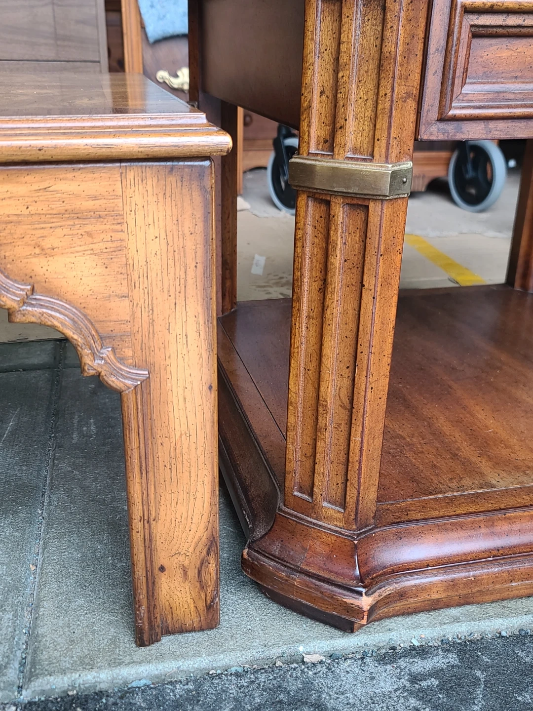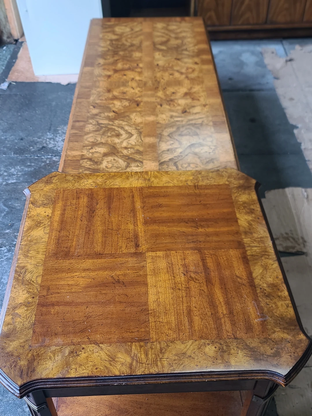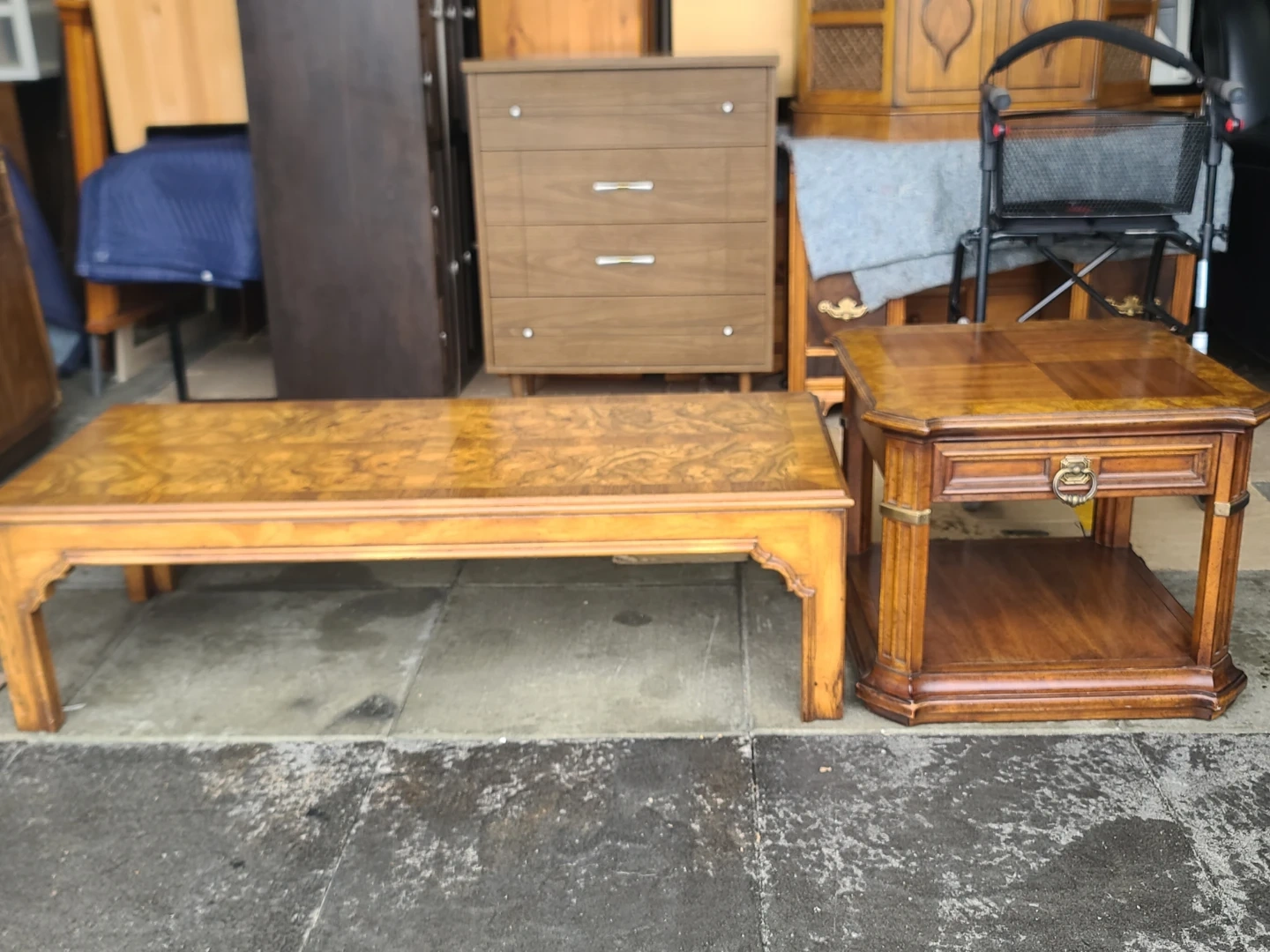 Classic wood coffee table and matching end table set. Coffee table is long and rectangular with a cool patterned wood top. End table is smaller, has a drawer with a ring pull and a lower shelf. Both tables have a similar patterned wood top and decorative legs. Great for a living room. Measurements for table: W 56" X D 24" X H 16". End Table : W 25" X D 24 1/2" X H 21". Delivery can be arranged. Viewing and pickup by appointment.