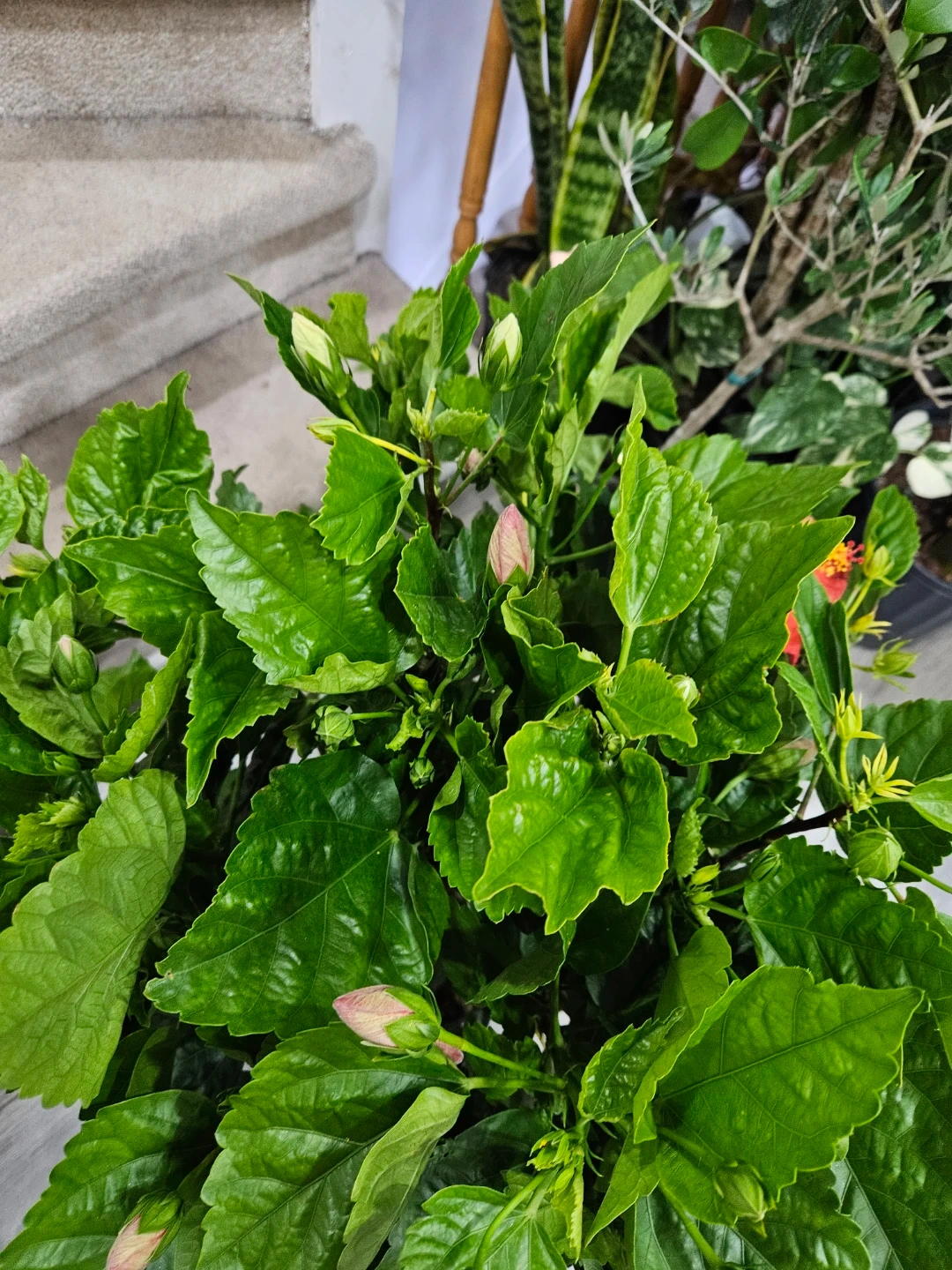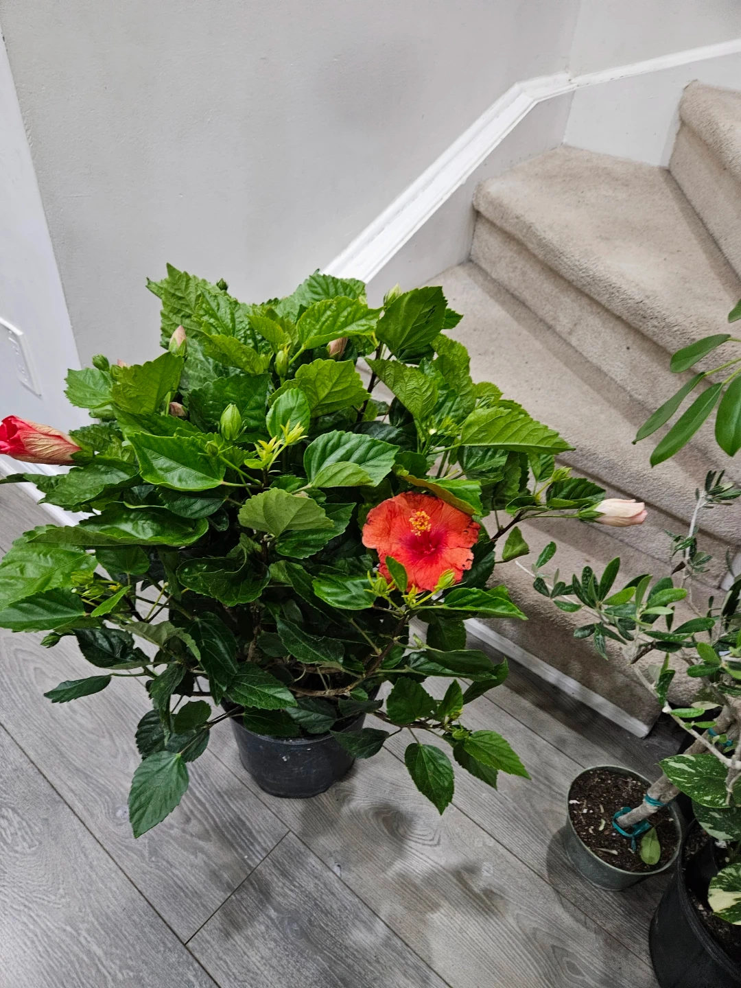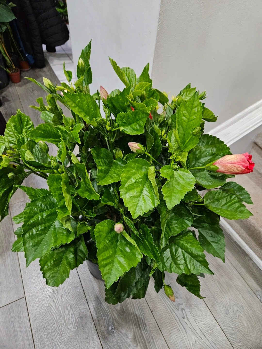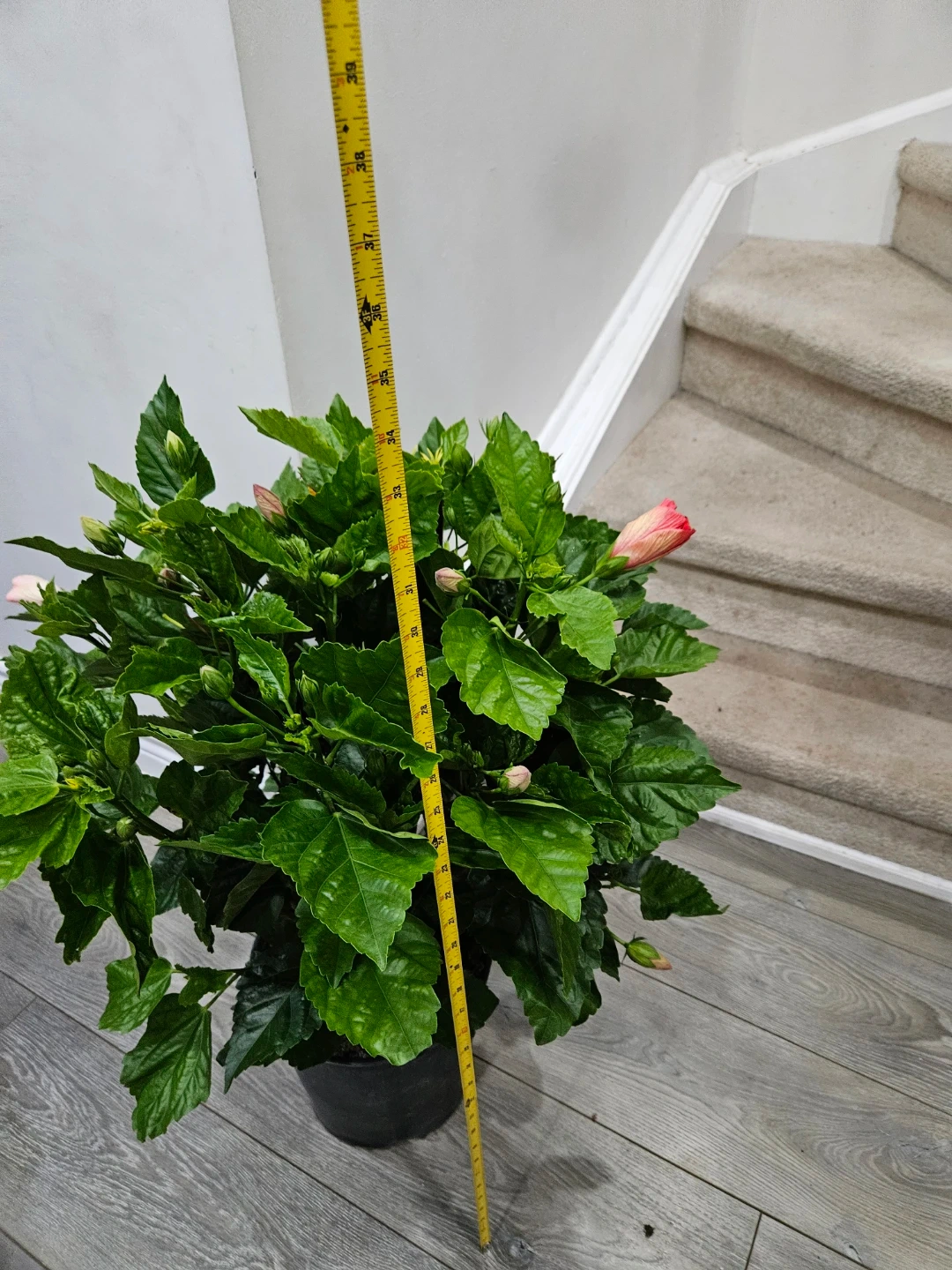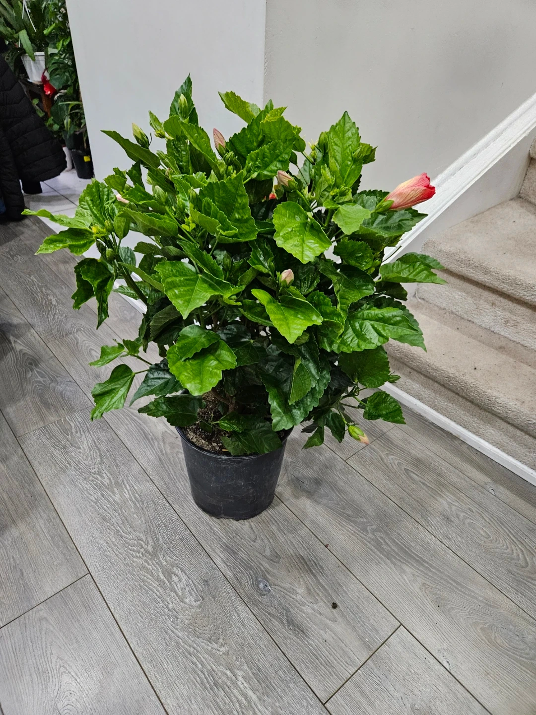Healthy hibiscus plant potted and ready to bloom. It's currently showing several vibrant flowers and numerous buds. Planted in a standard black pot.