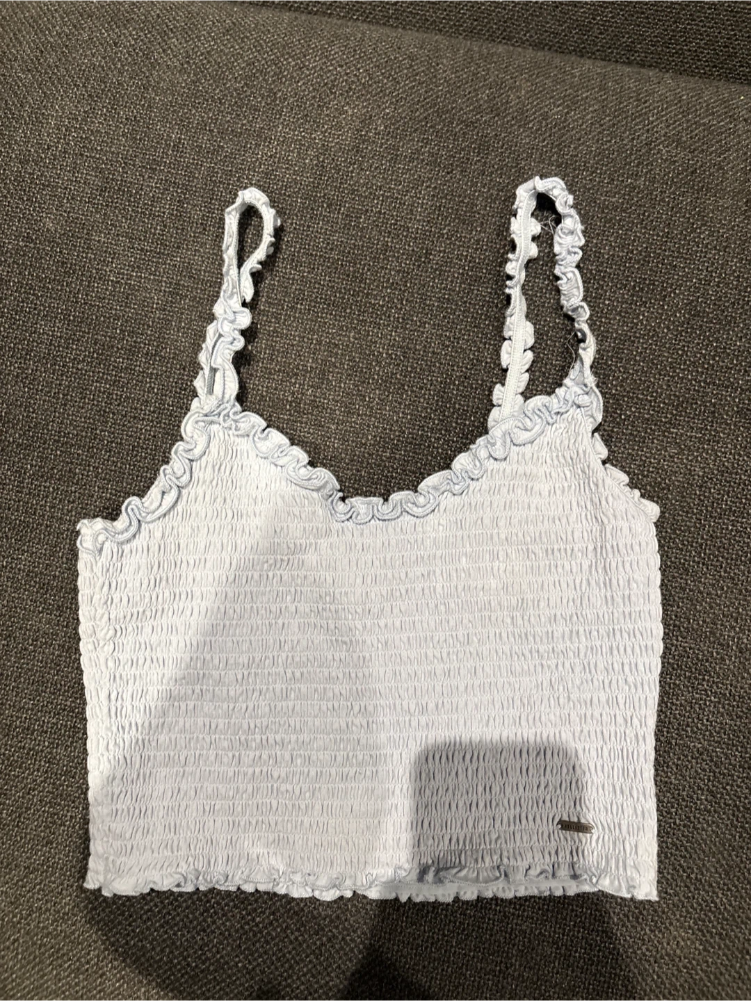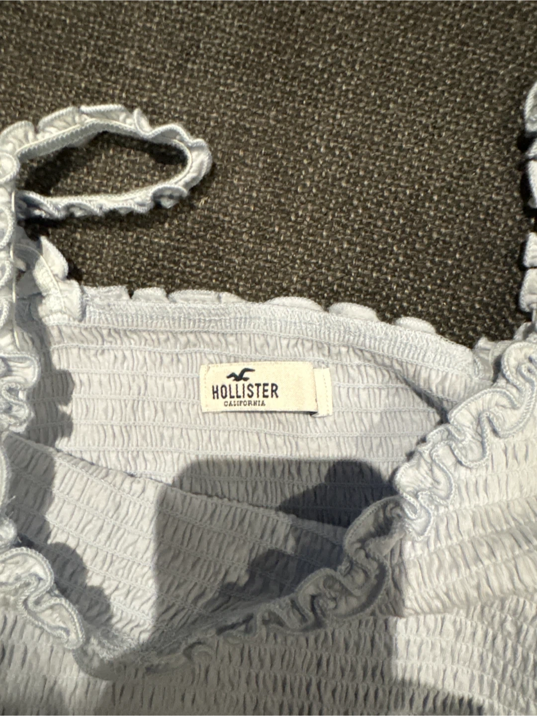 This is a light blue crop top from Hollister. It features ruffled straps and hem. Made with a stretchy fabric for a comfortable fit.
