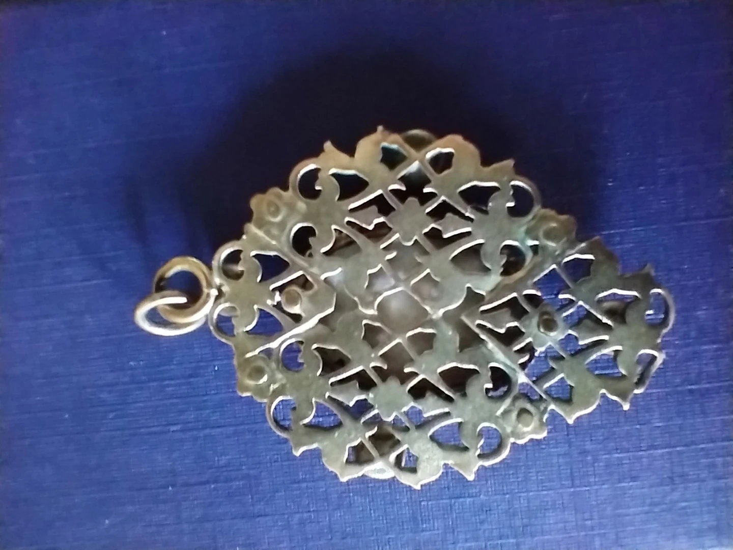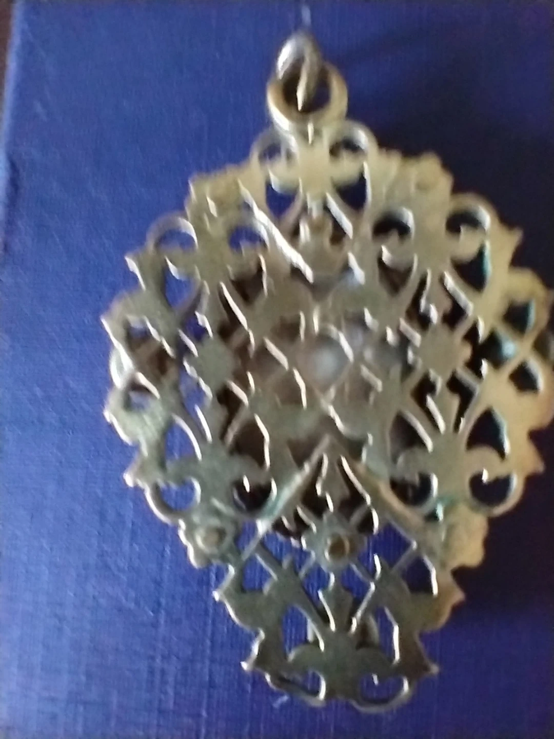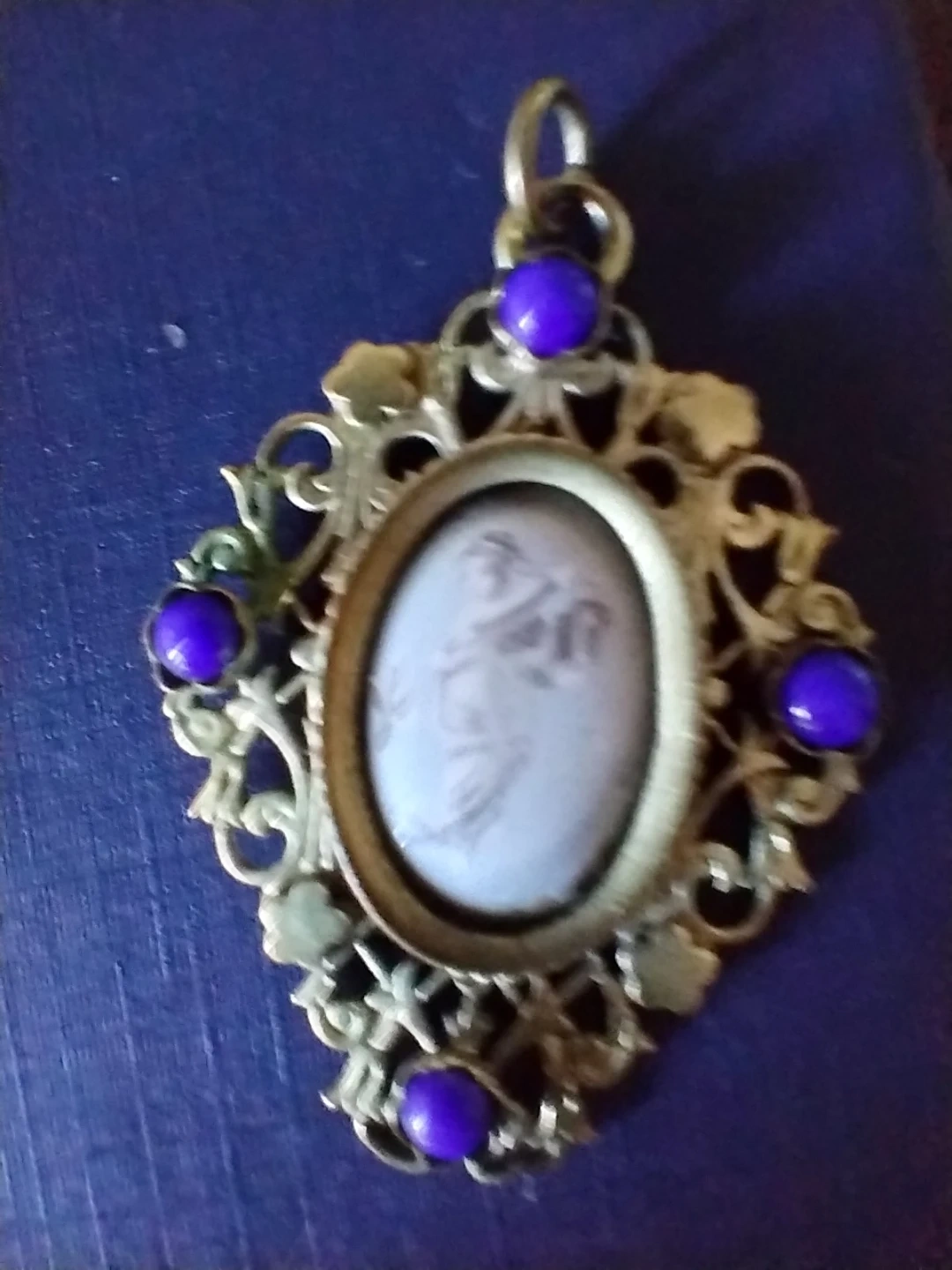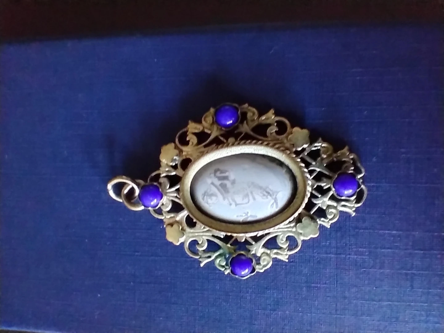 This vintage pendant features an ornate metalwork design with small, vibrant blue gem accents. It has an oval-shaped compartment that appears to hold a miniature image or memento. It's a unique accessory with a classic, decorative style.