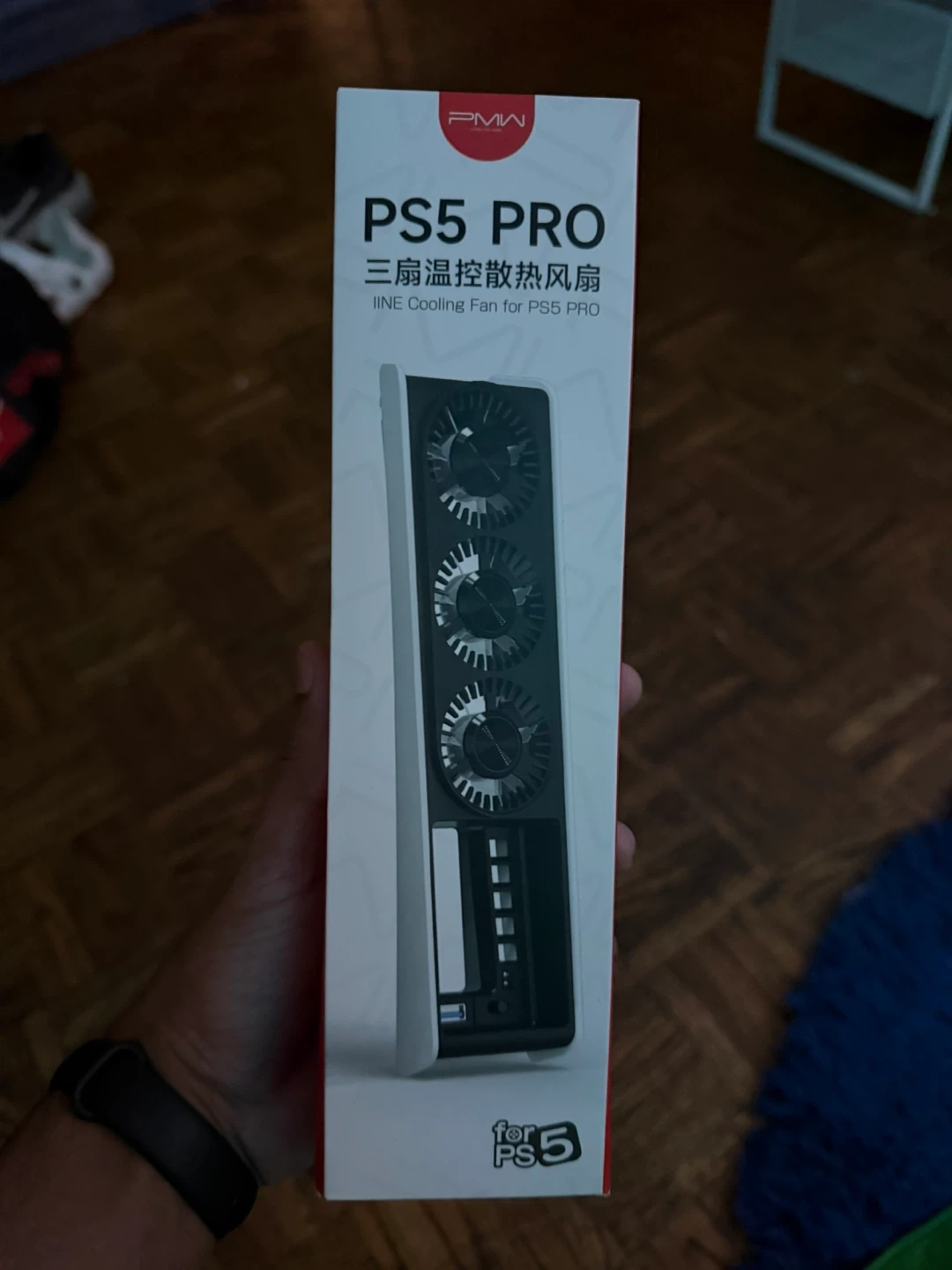 This is a PMW brand cooling fan designed for the PS5 PRO. It features three temperature-controlled fans to help keep your console cool during intense gaming sessions. The fan is designed to attach to the side of the PS5.