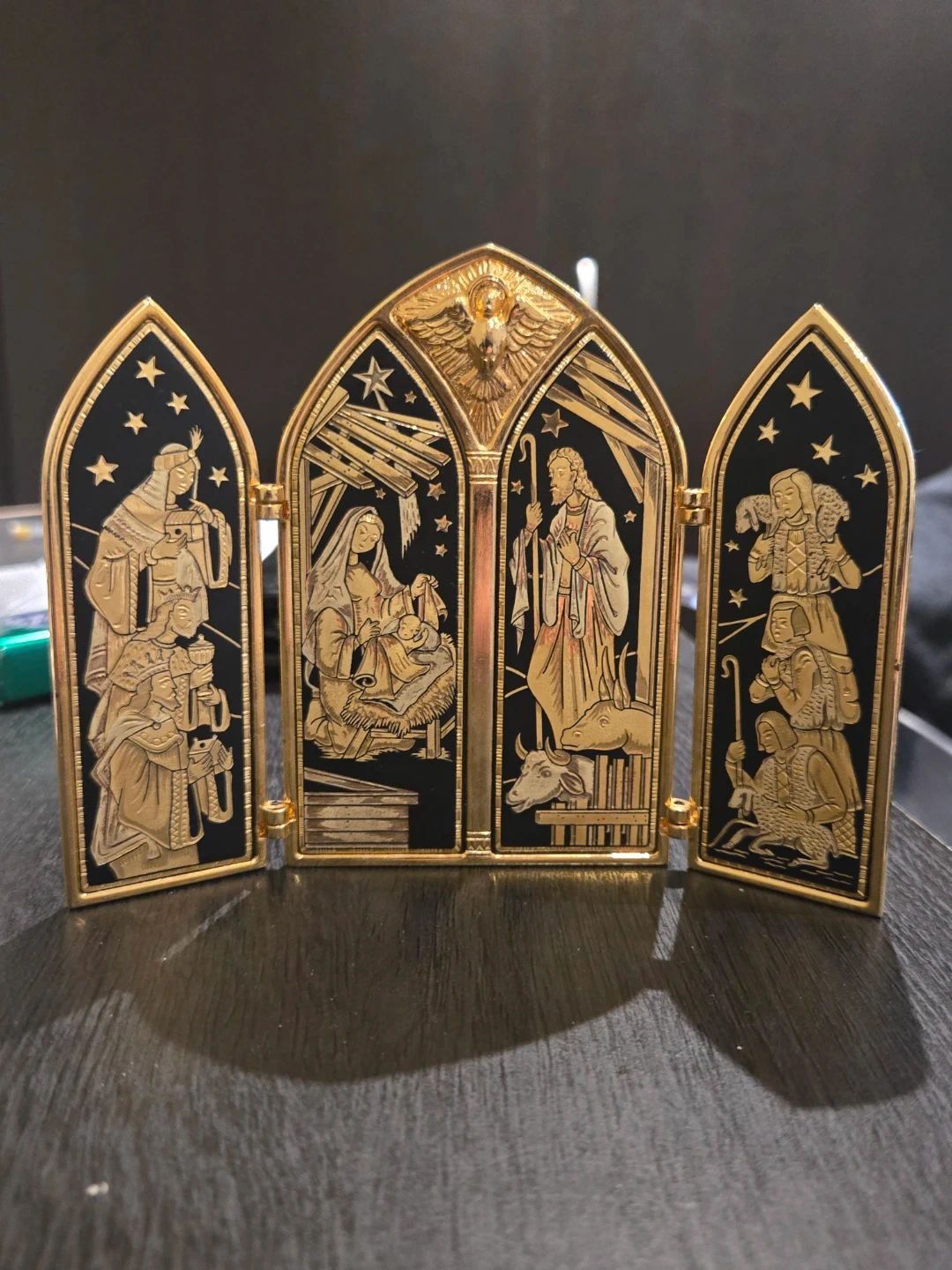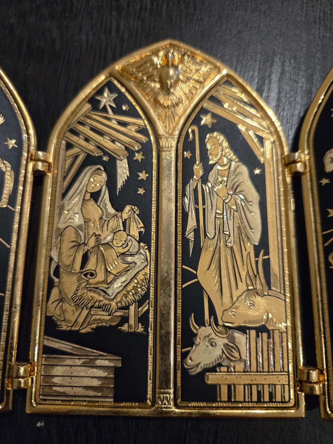 A charming gold-toned triptych depicting the Nativity scene. It's intricately detailed with figures of Mary, Joseph, baby Jesus, the wise men, and shepherds. This decorative piece would be a lovely addition to holiday décor.
