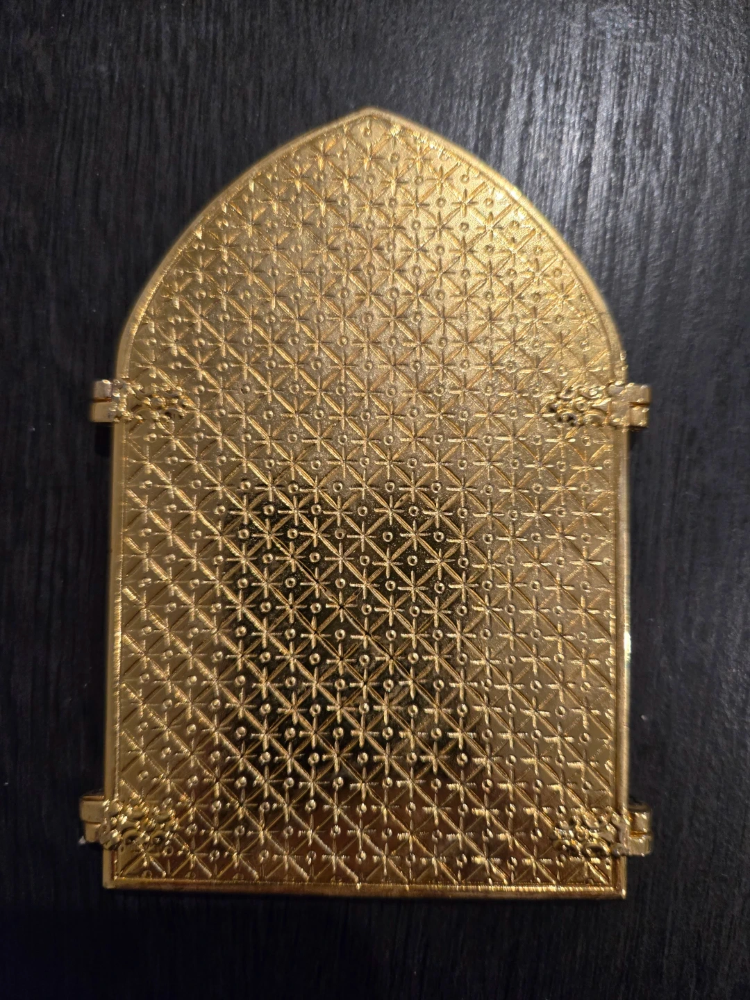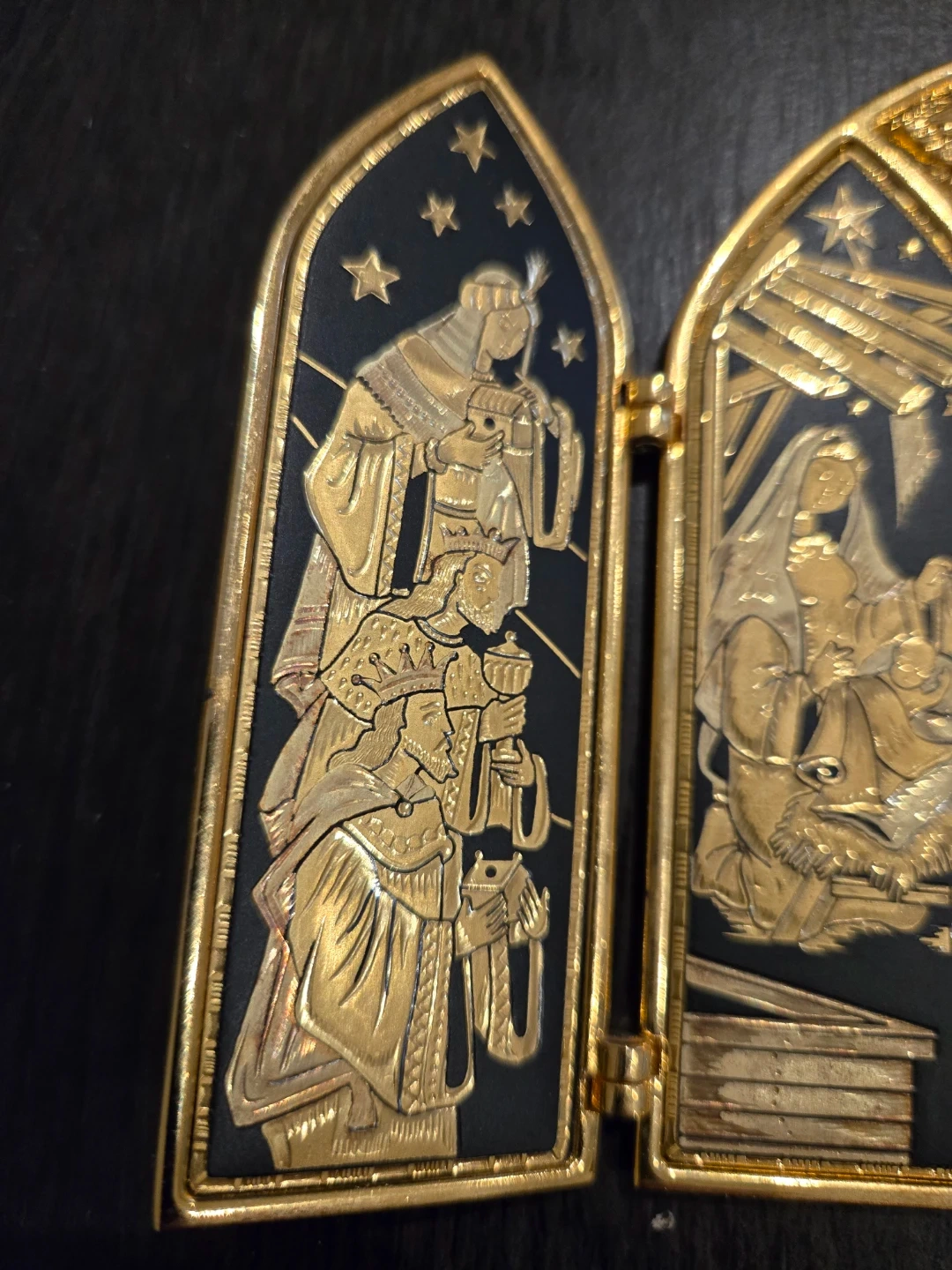 This triptych is hand inlaid with 24kt yellow thread and 18kt green, if it represents the Nativity scene.