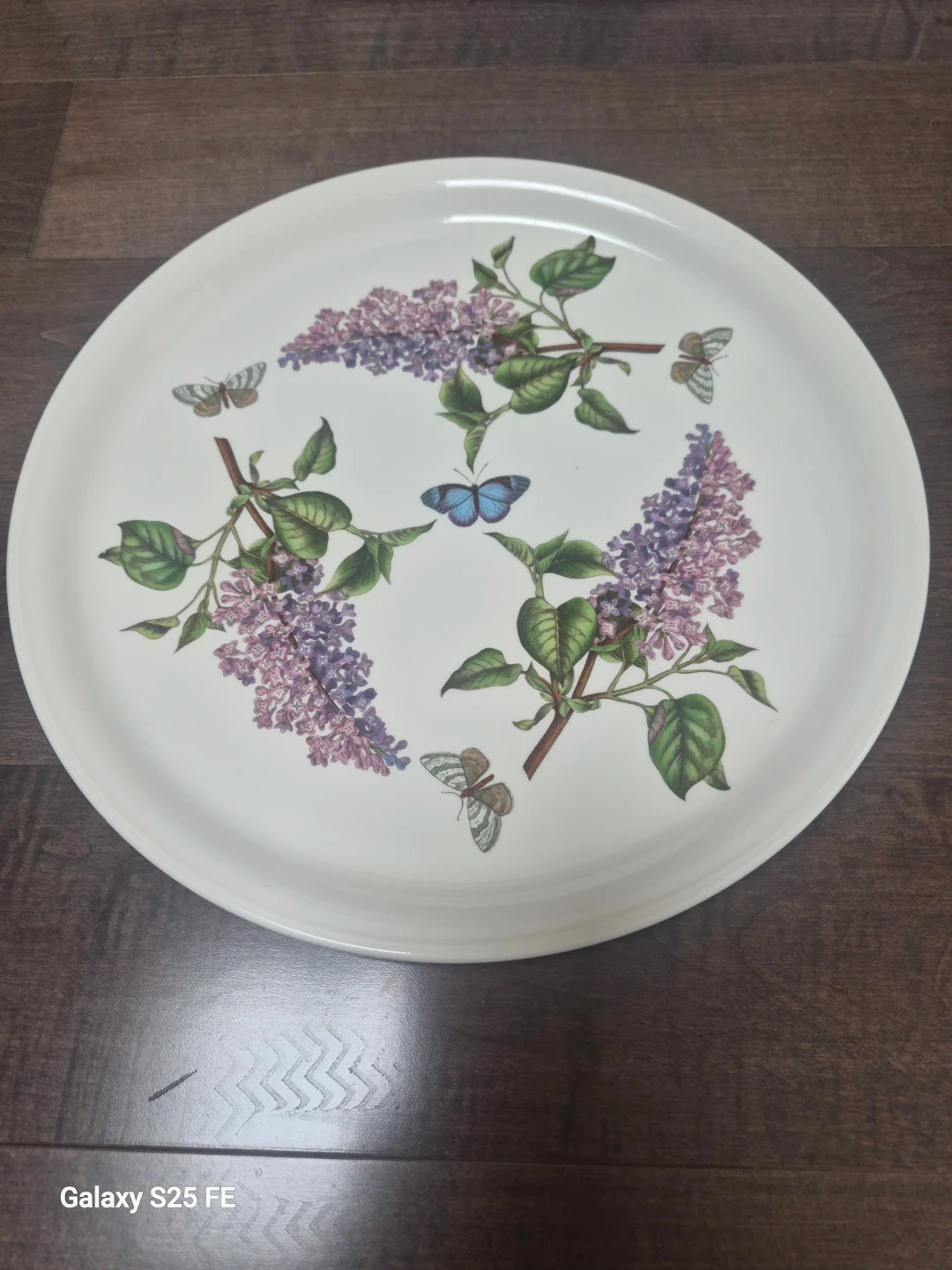 A lovely round serving tray featuring a lilac and butterfly design. It's made of a durable material and would be great for serving snacks or as a decorative piece. The classic design adds a touch of charm to any setting!