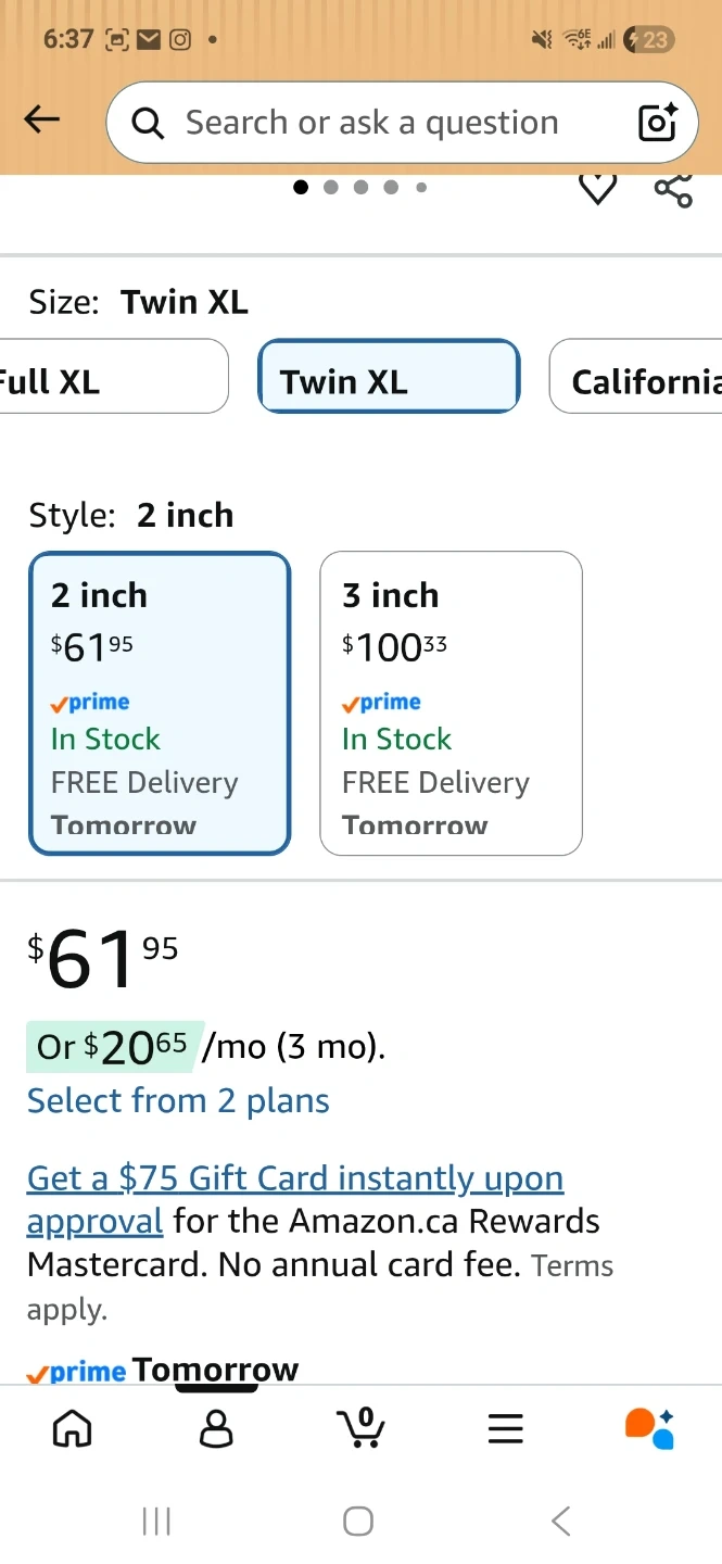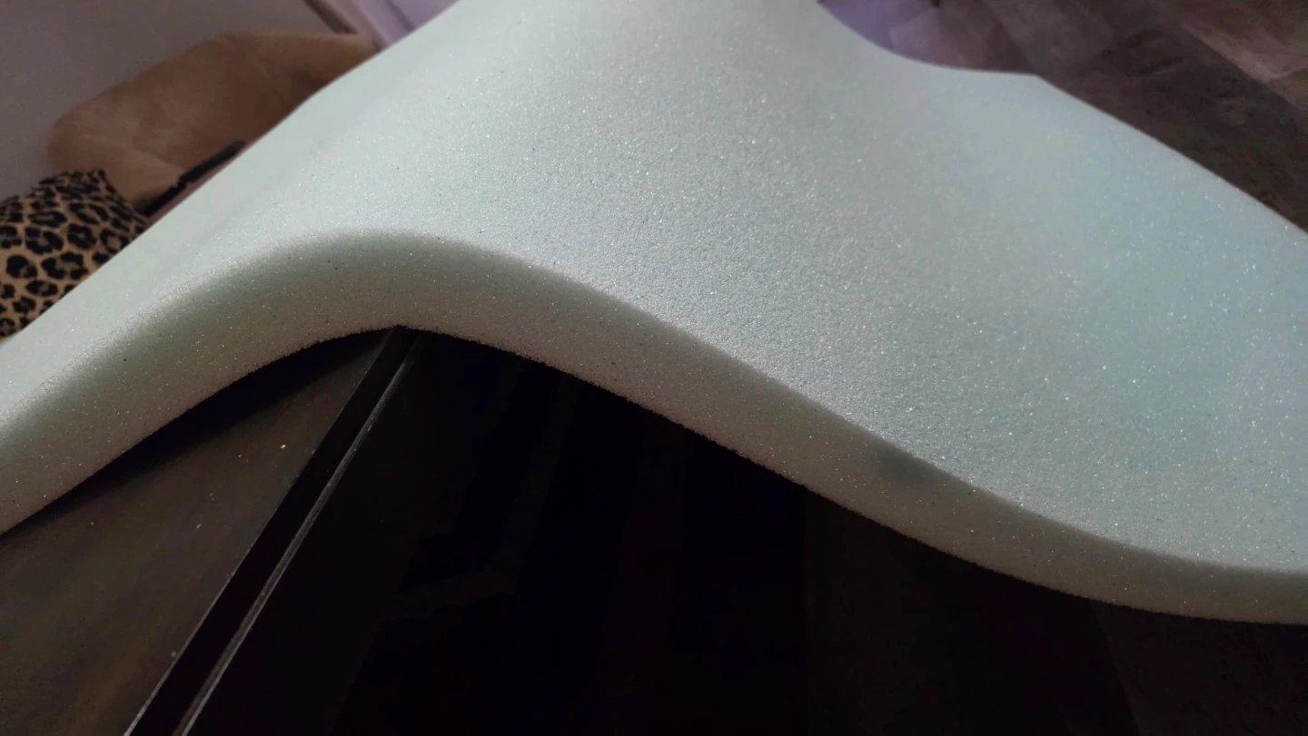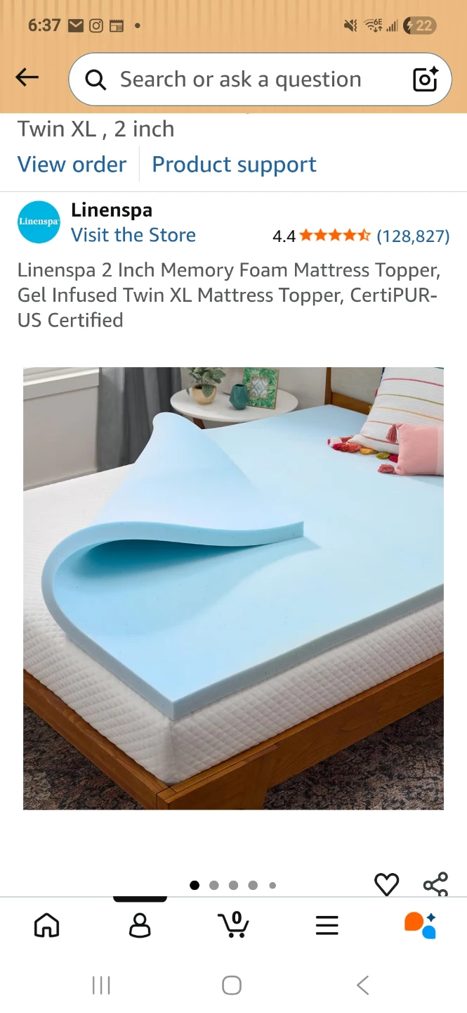 2 inch memory foam mattress topper, twin XL. Used on my daughter's dorm bed to make it more comfortable. Always covered by a mattress protector.
