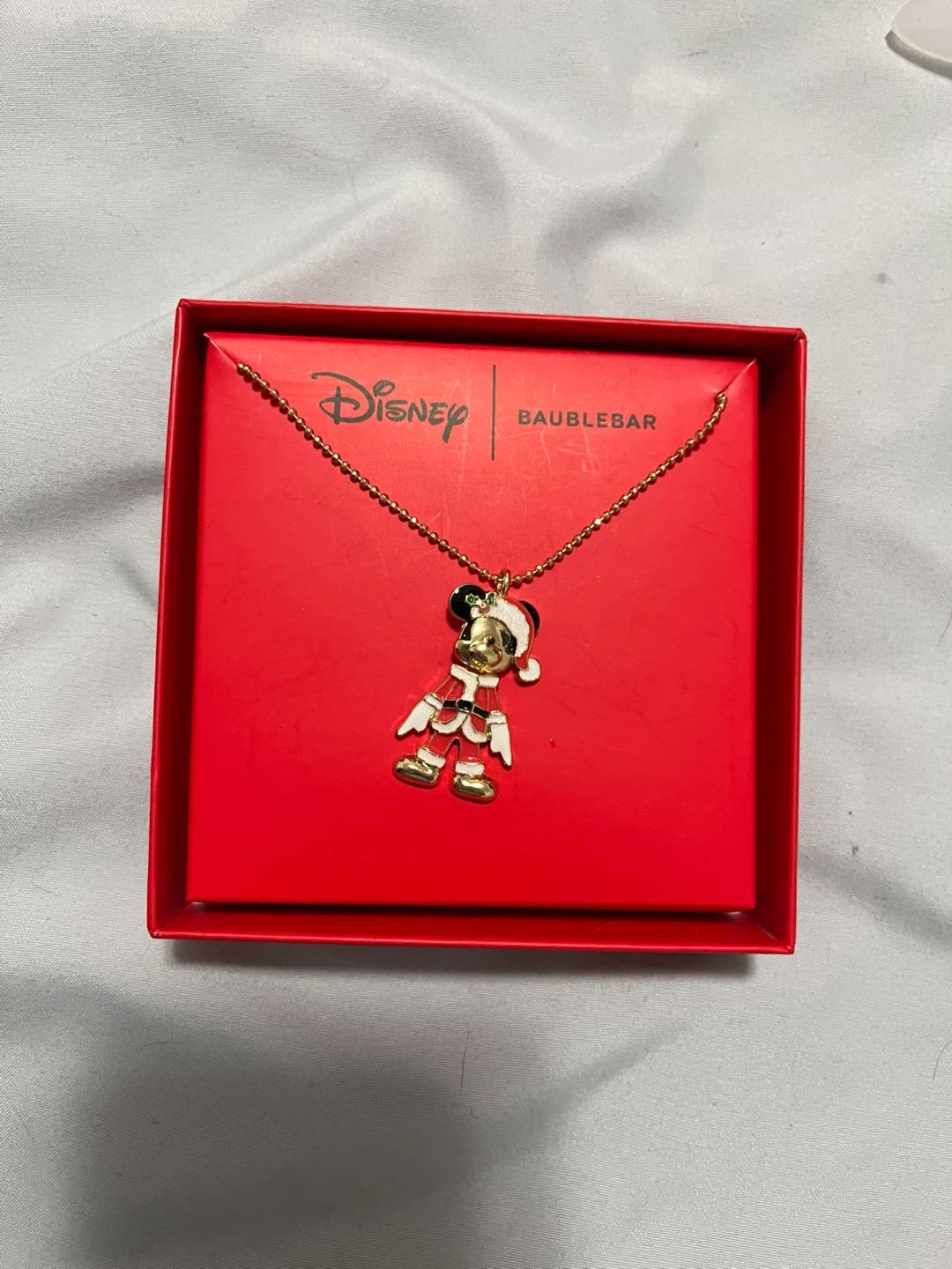 This Disney Baublebar necklace features a festive Mickey Mouse charm in a Santa outfit. The chain is gold-toned and it comes in its original red box.