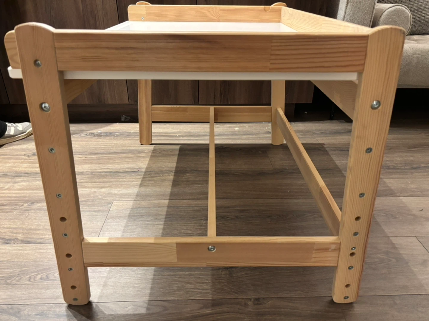 Wooden art easel and table for kids. Includes adjustable height settings. Dimensions: 97 cm wide x 65 cm deep.