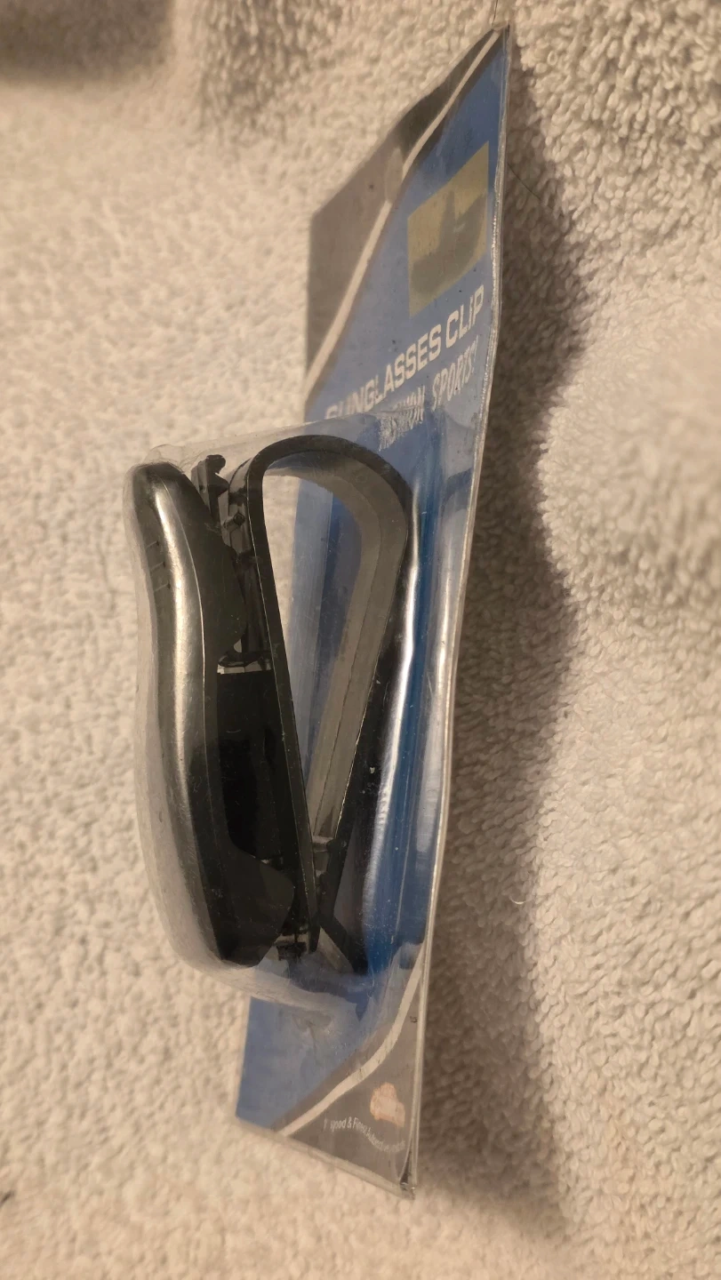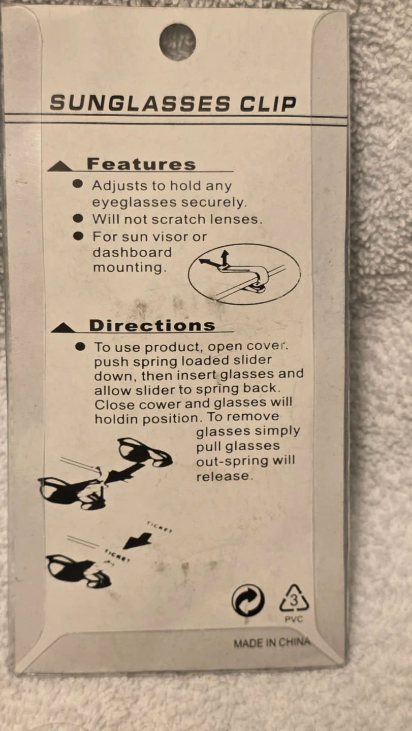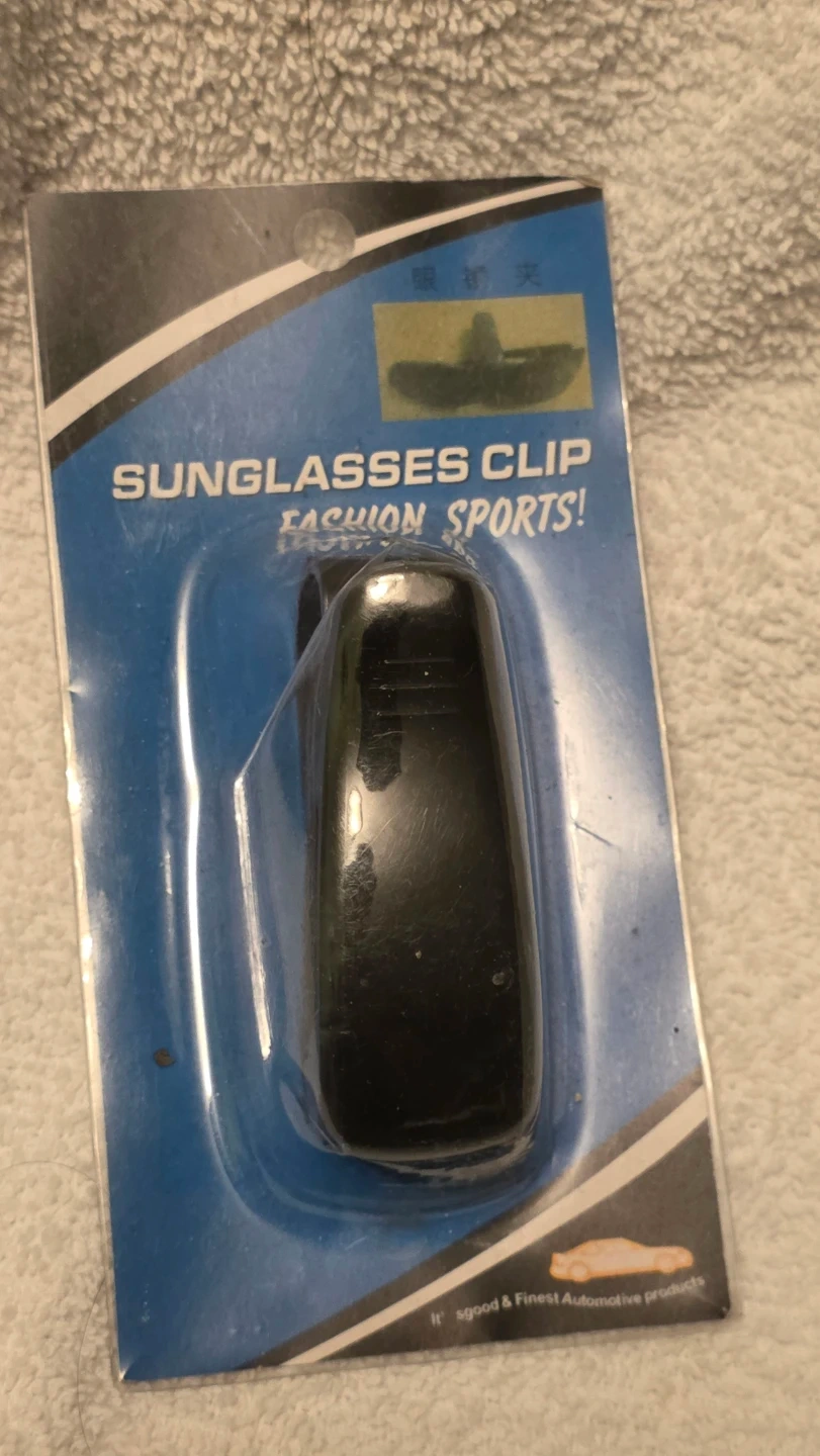 This sunglasses clip attaches to your car's sun visor or dashboard. It adjusts to hold eyeglasses securely without scratching lenses. It's made of PVC material.