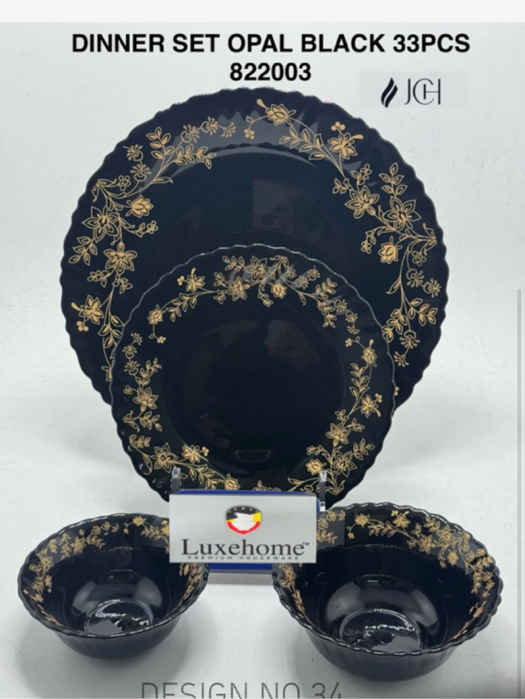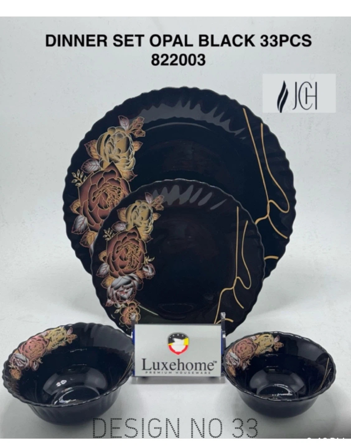 Selling a Luxehome dinner set in opal black, complete with 33 pieces! The set features a lovely floral design. Perfect for adding a touch of elegance to your dining experience