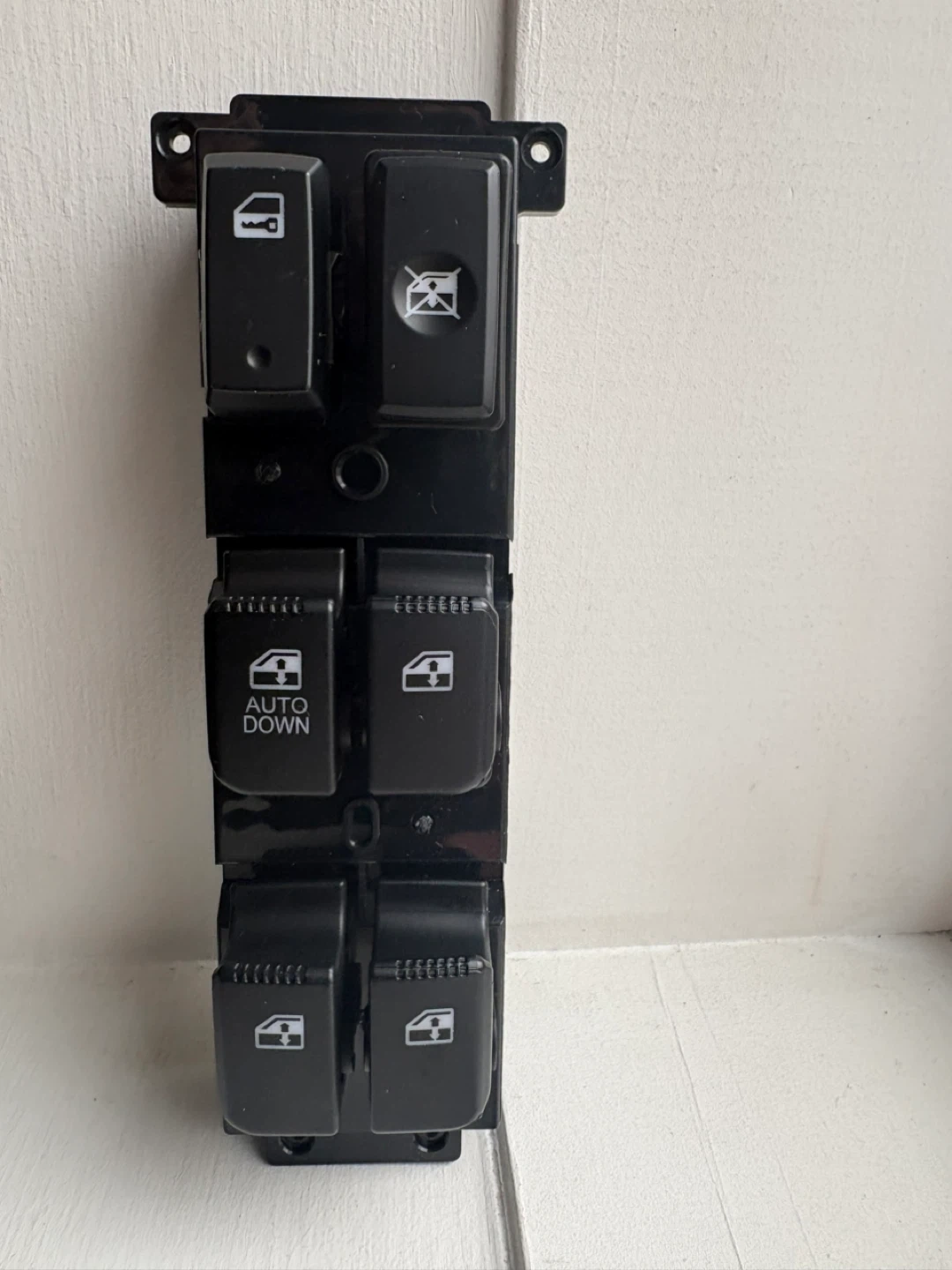 This is a power window switch assembly for a Hyundai Santa Fe. It's compatible with models from 2006 to 2012. The unit includes controls for driver and passenger windows, including an auto-down function.