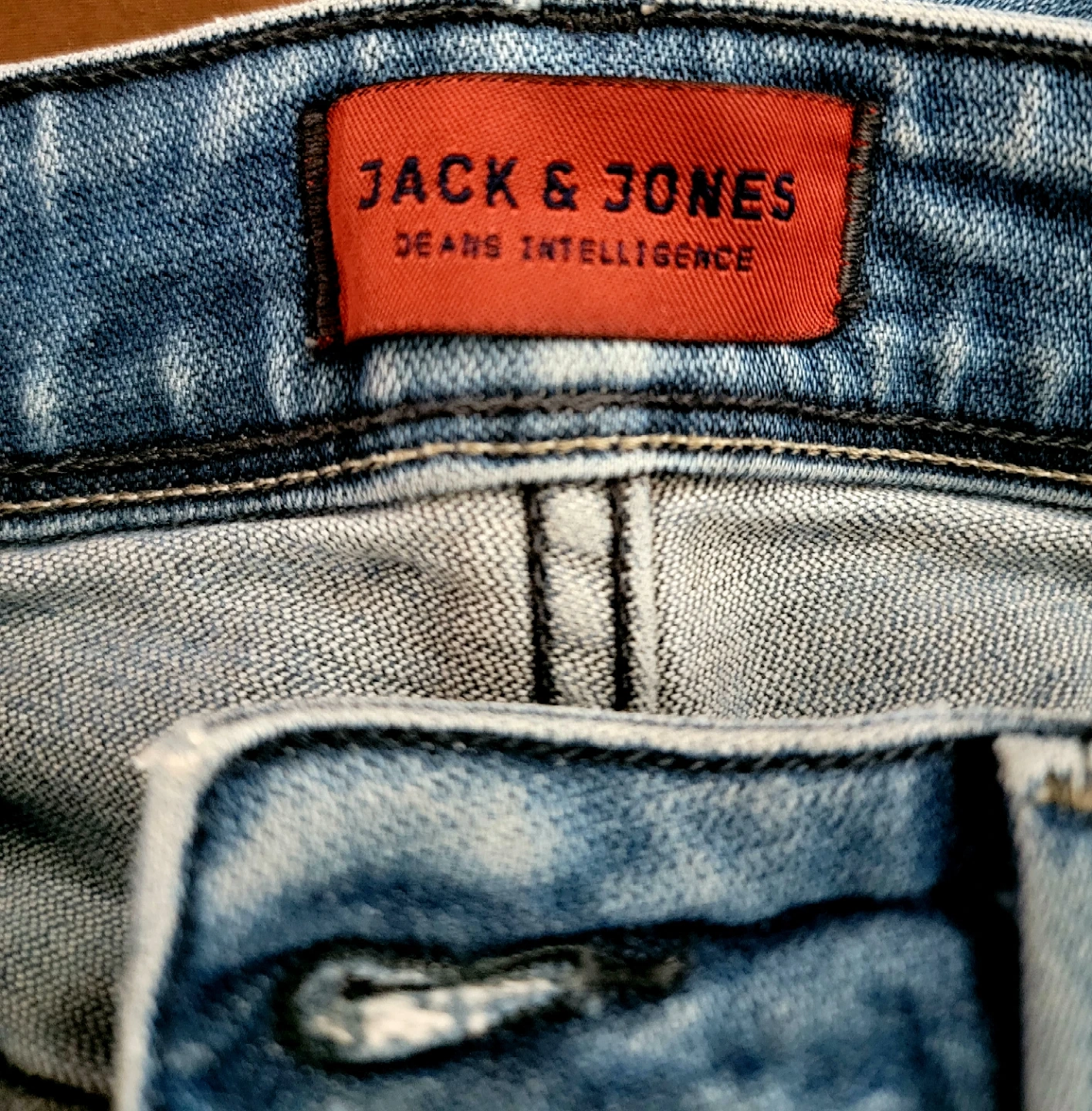 Jack & Jones men's light wash denim jeans. Slim fit style, Glenn model. Features distressed details and button fly. Size 33/34.