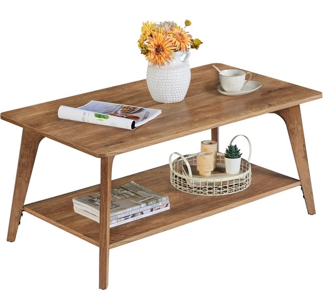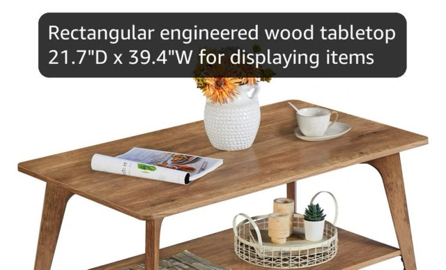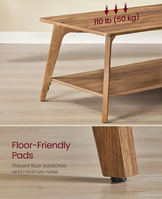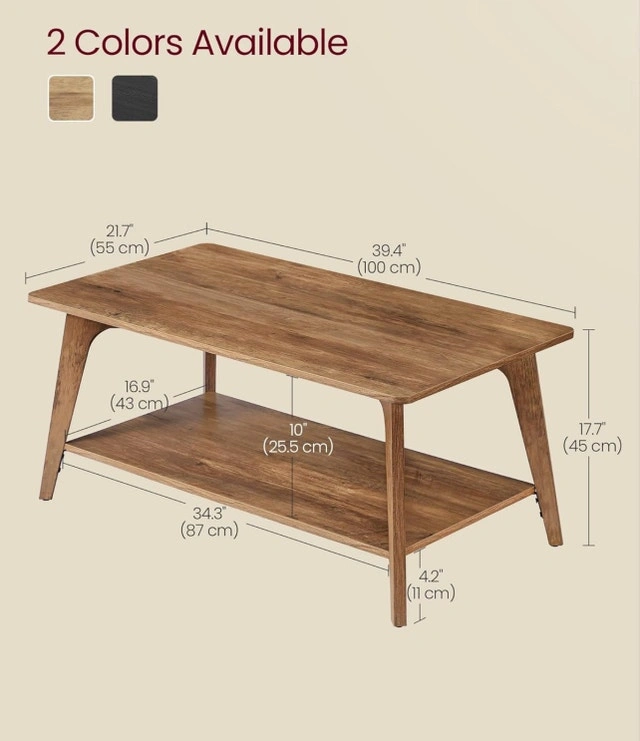 This brand new, two-tier coffee table is the perfect centrepiece for any living room, featuring a rectangular engineered wood tabletop, lower shelf for storage of books and magazines, and tapered legs. Rectangular engineered wood tabletop: 21.7" D x 39.4" W. Lower shelf for storage of books and magazines. Floor-friendly pads prevent floor scratches and minimize noise. Weight capacity: 110 lb (50 kg).