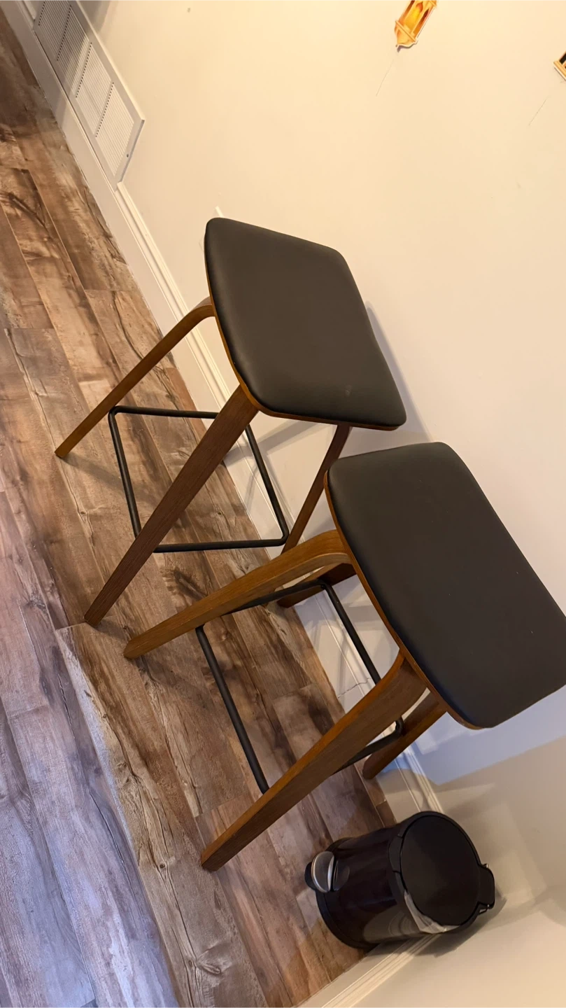 Offering a set of two modern counter stools. They feature black faux leather seats with bentwood frames and black metal footrests. Perfect for a kitchen island or bar area!