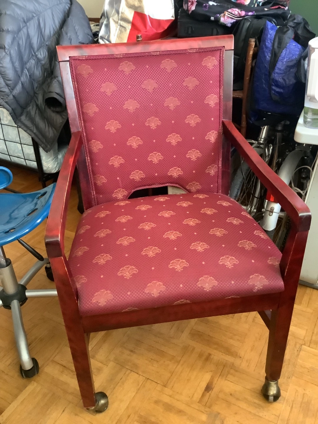 A burgundy armchair with a damask pattern. It's upholstered and has wooden arms with casters on the legs. This chair would be suitable for a study or a reading nook.