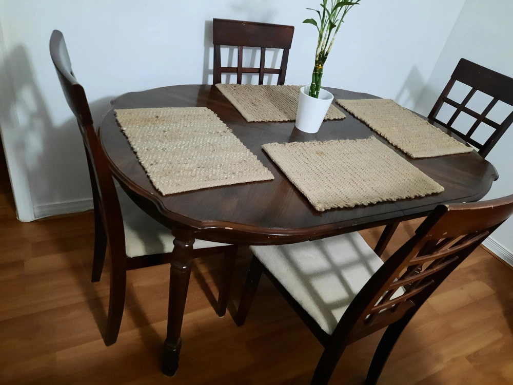 Dark brown wood dining table with four matching chairs. Oval table top. Minor wear and tear. Good for small spaces.