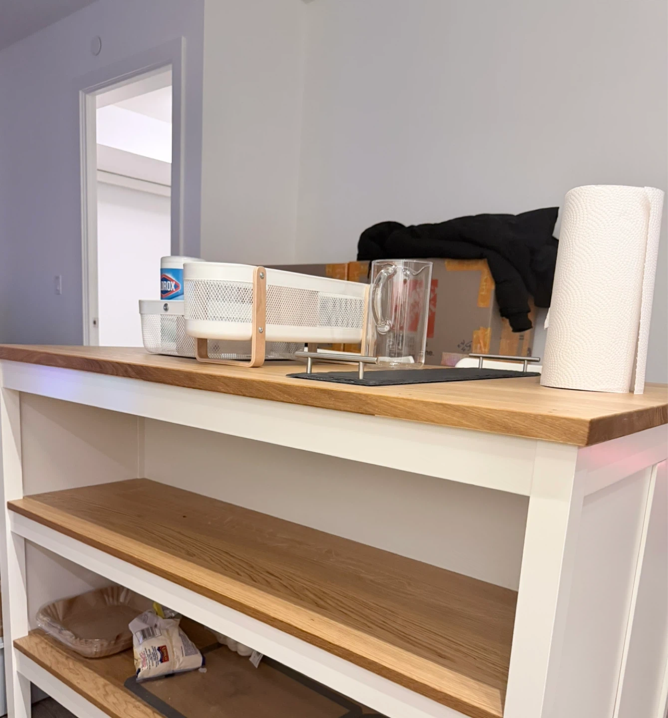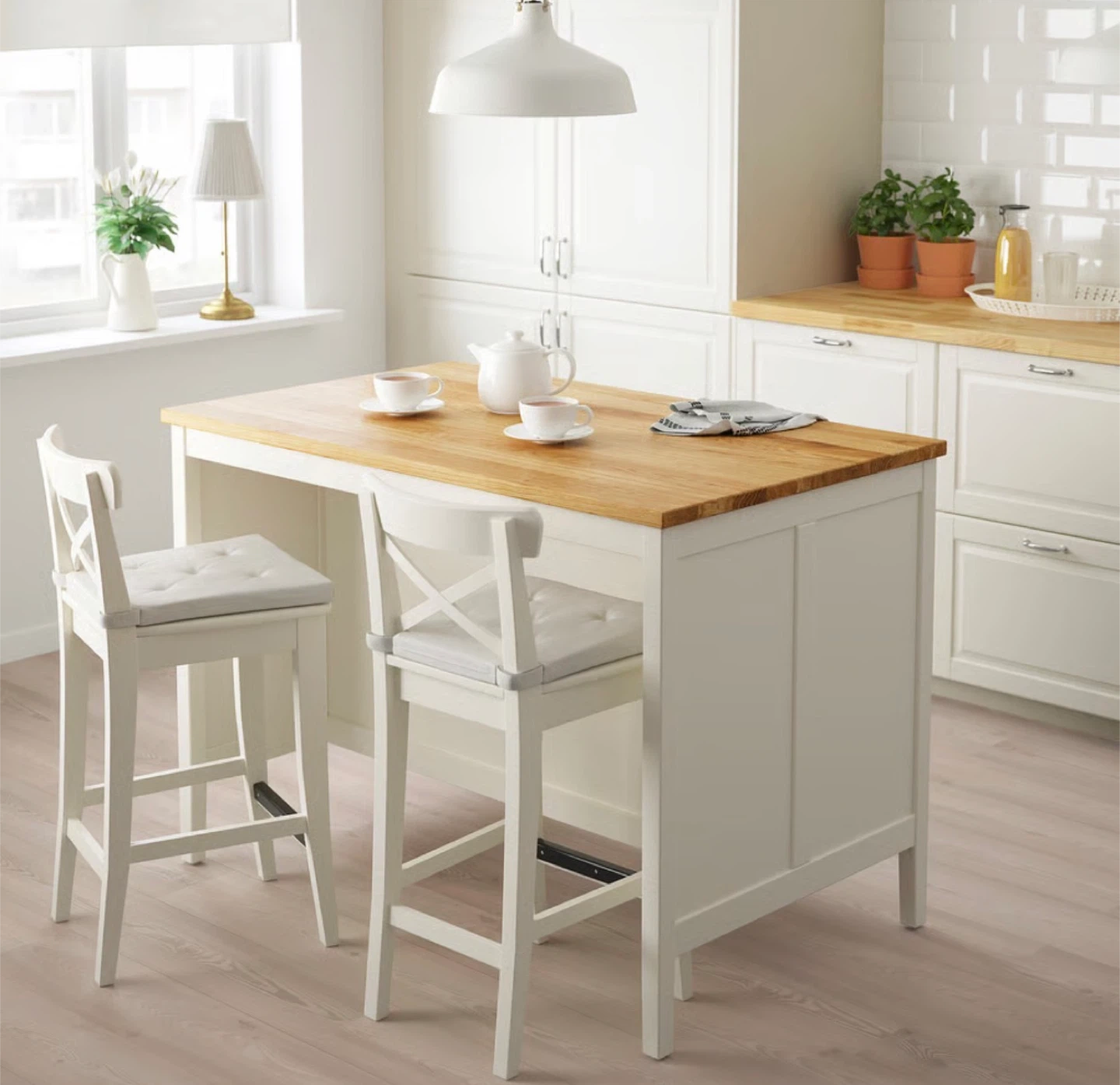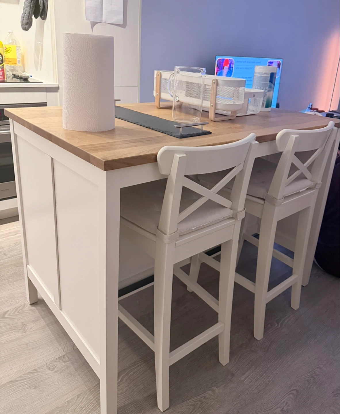 Kitchen Island with two bar stools and cushions. Ample storage space is available with shelves on the side. Great for small kitchens. Measurements are in the images. Pick up location close to Queen W and Spadina
