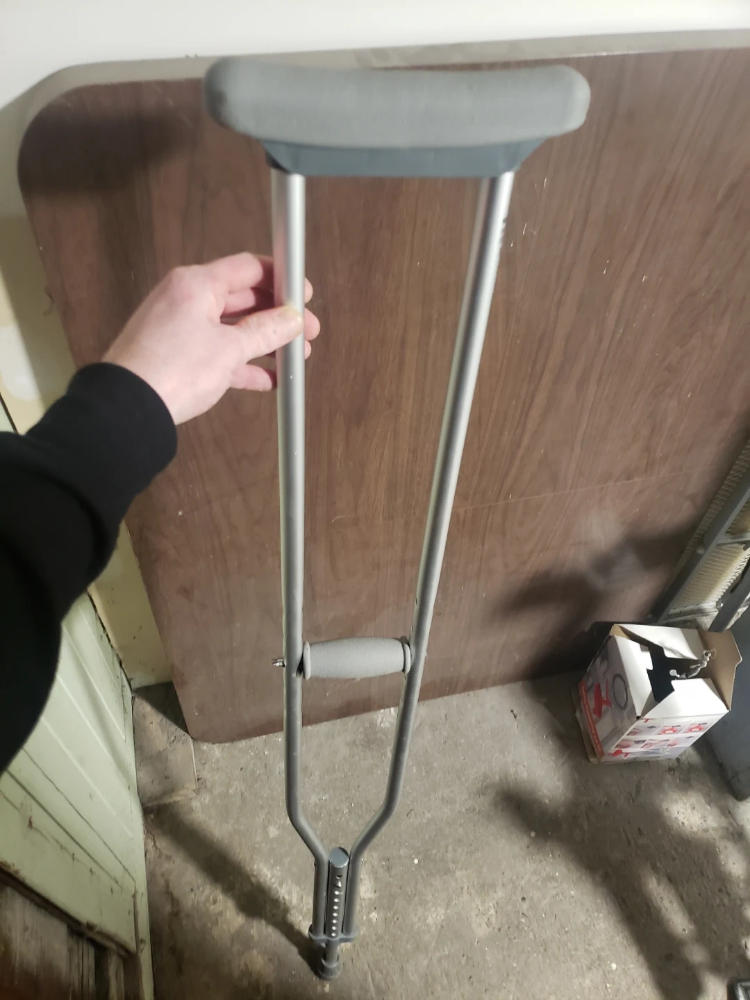 made of silver-coloured aluminum. The crutch features a pin-lock system for height adjustment. Useful for temporary mobility support.