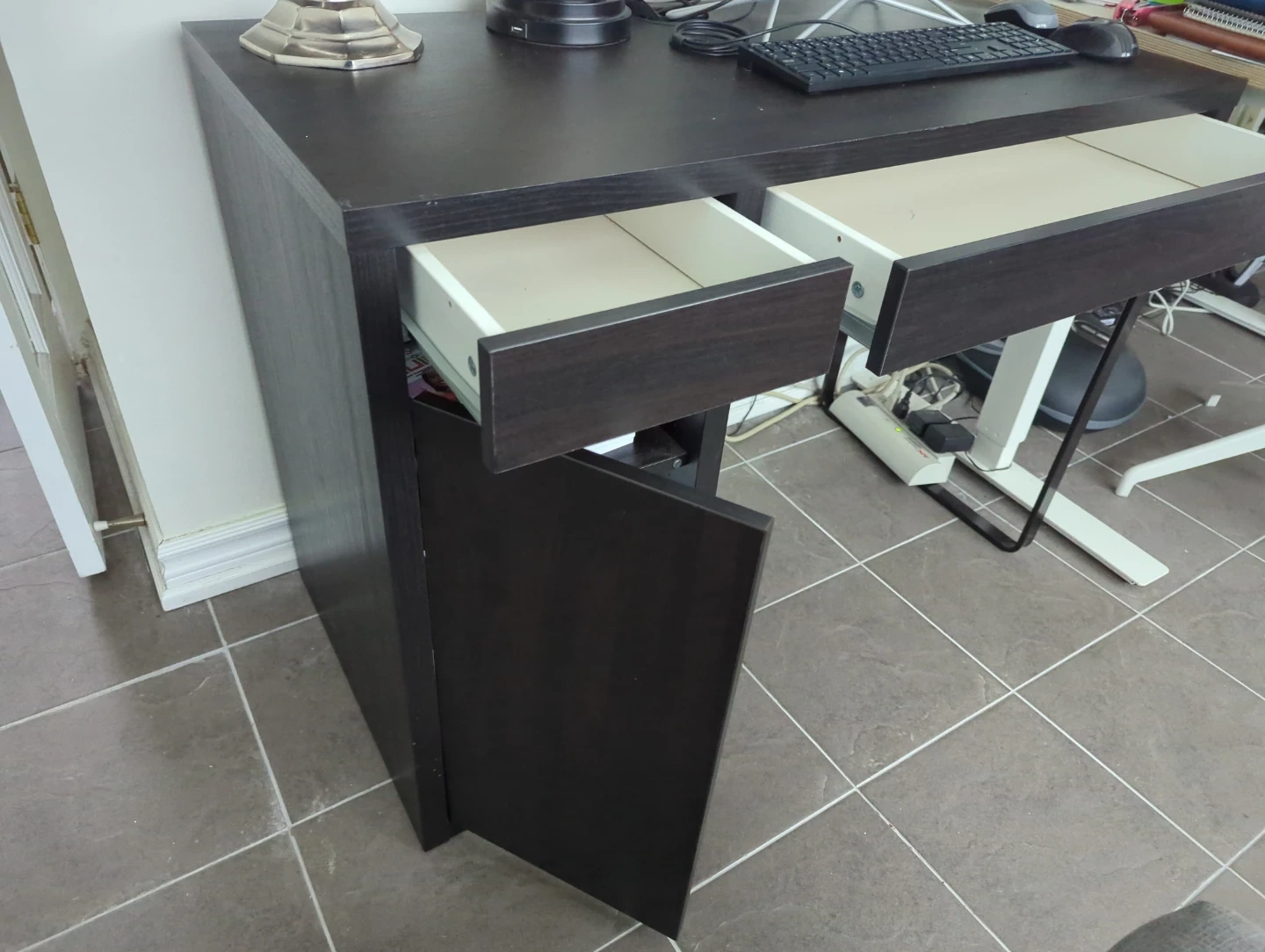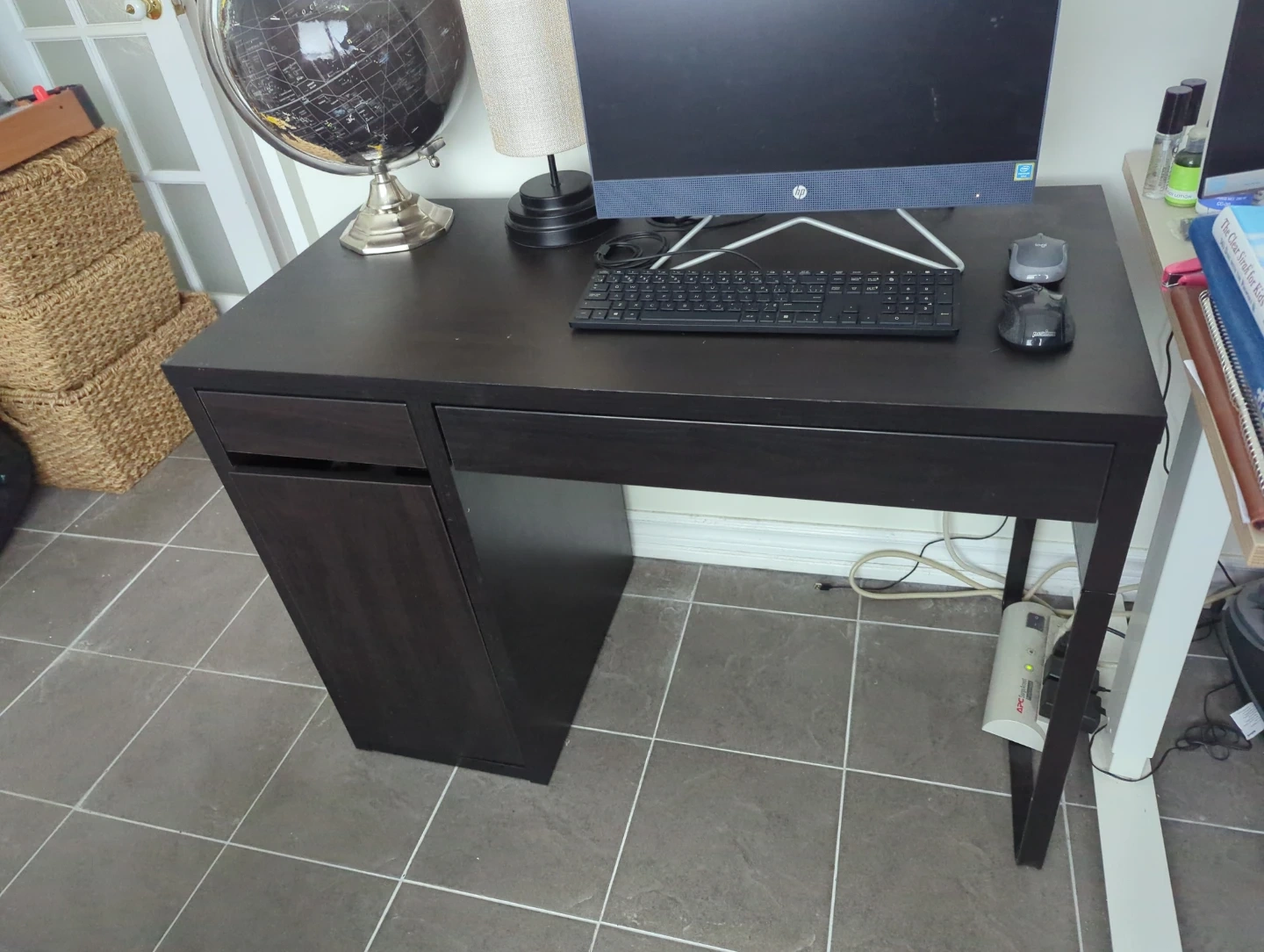 This dark wood desk offers ample workspace and storage. It features two drawers and a cabinet for keeping your items organized. Its simple, functional design fits well in most home offices.