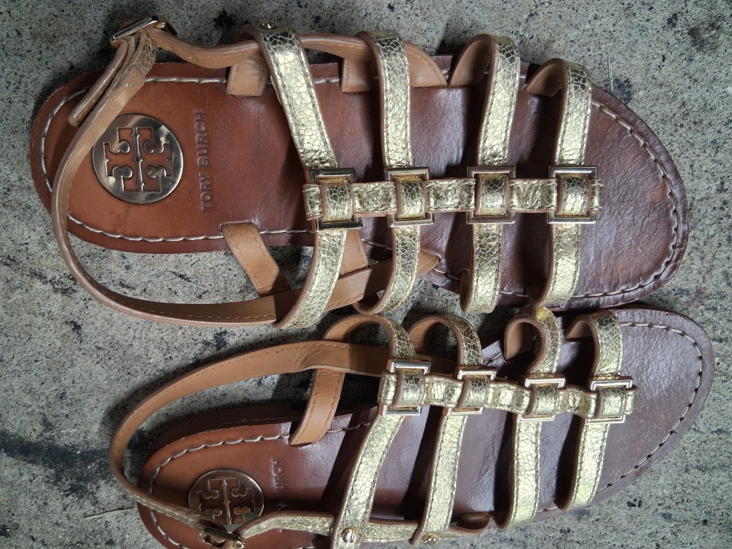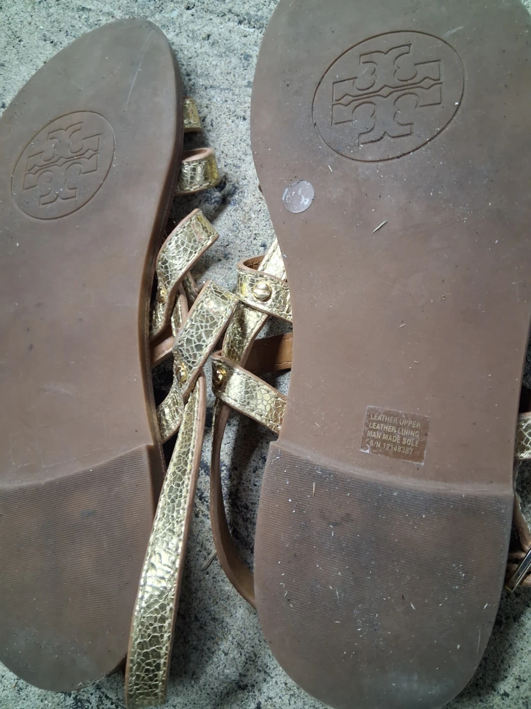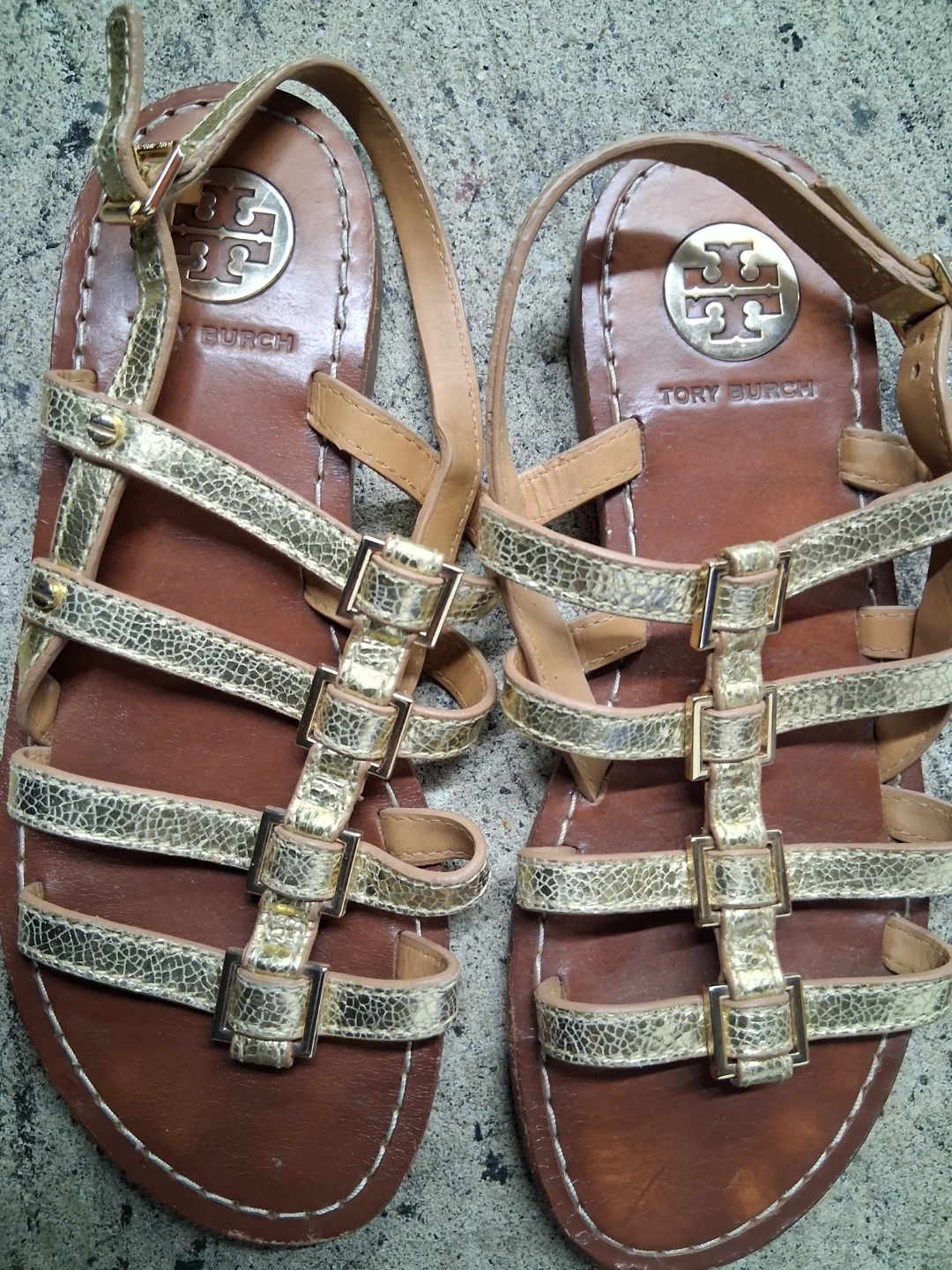 Tory Burch sandals with gold metallic straps and leather upper. These sandals feature a buckle closure and the iconic Tory Burch logo.