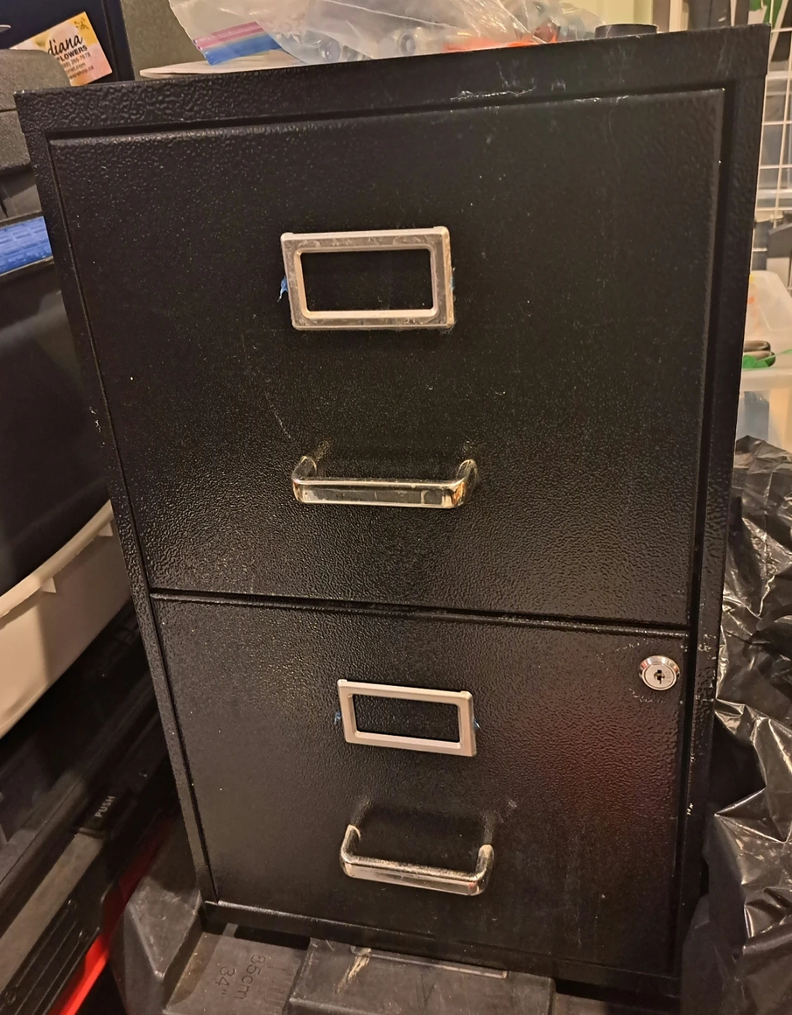 This is a black metal filing cabinet with two drawers. It has silver-toned handles and label holders on each drawer. One drawer includes a key lock for security. The textured finish gives it a sturdy appearance.