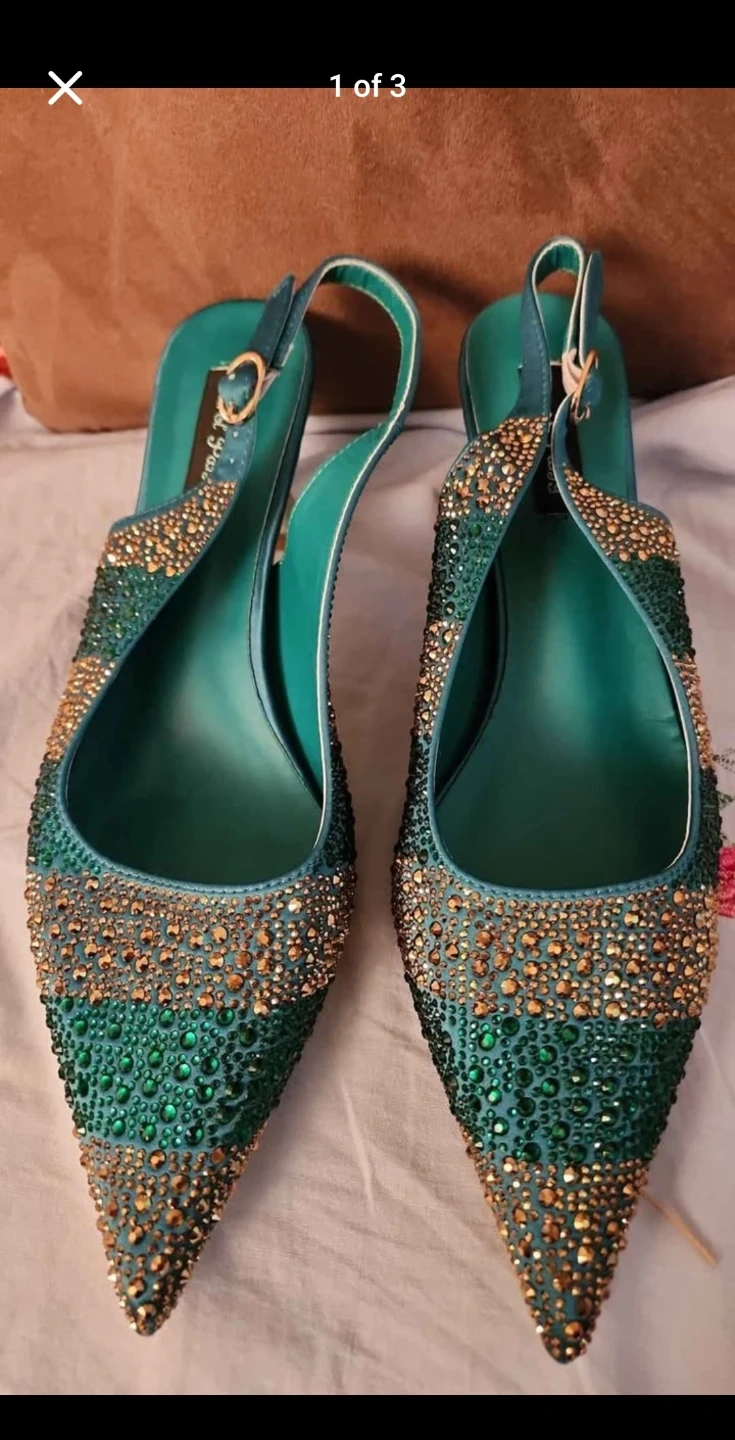 Sparkly green slingback heels adorned with rhinestones. These stylish shoes feature a pointed toe and a low block heel. Perfect for a night out or a special occasion!