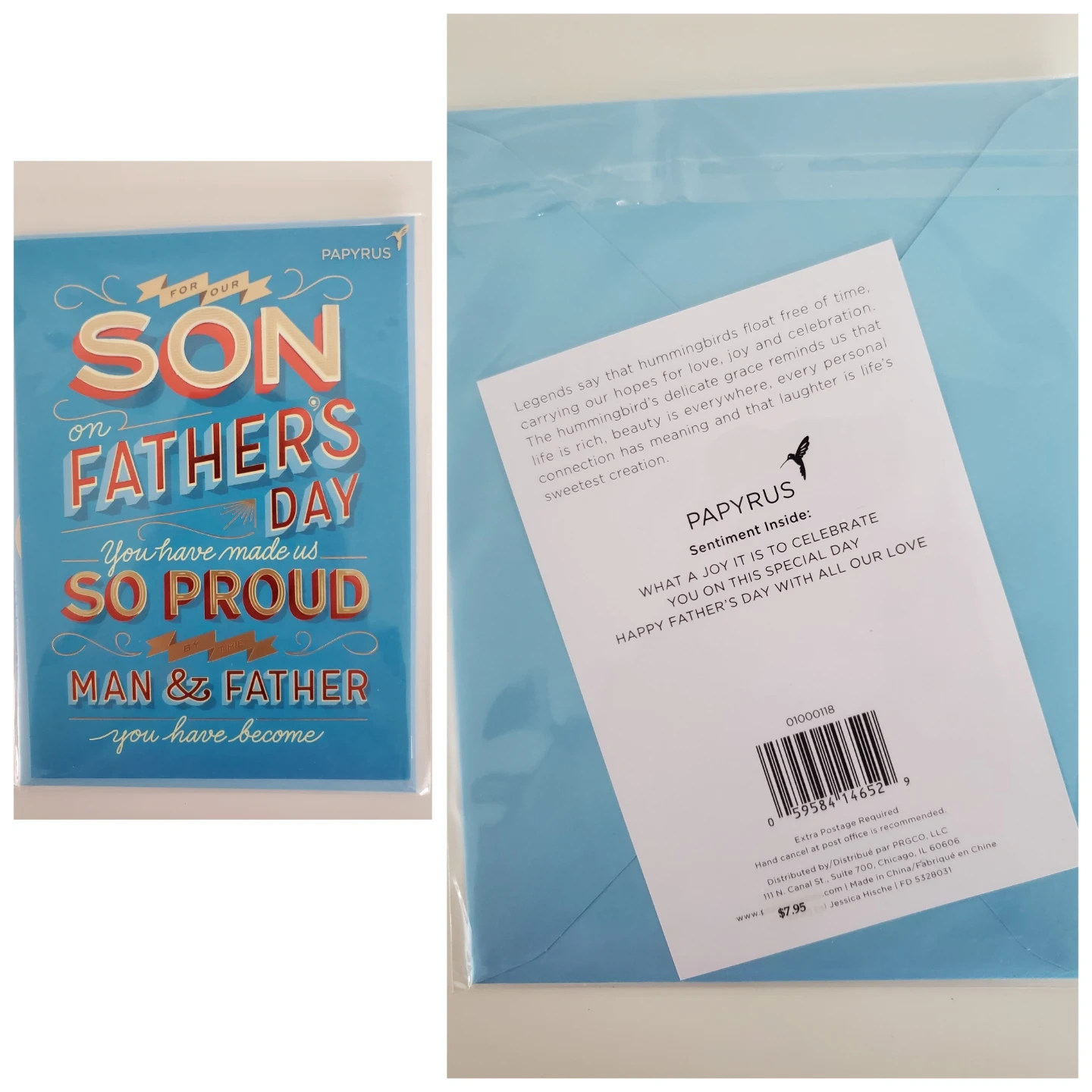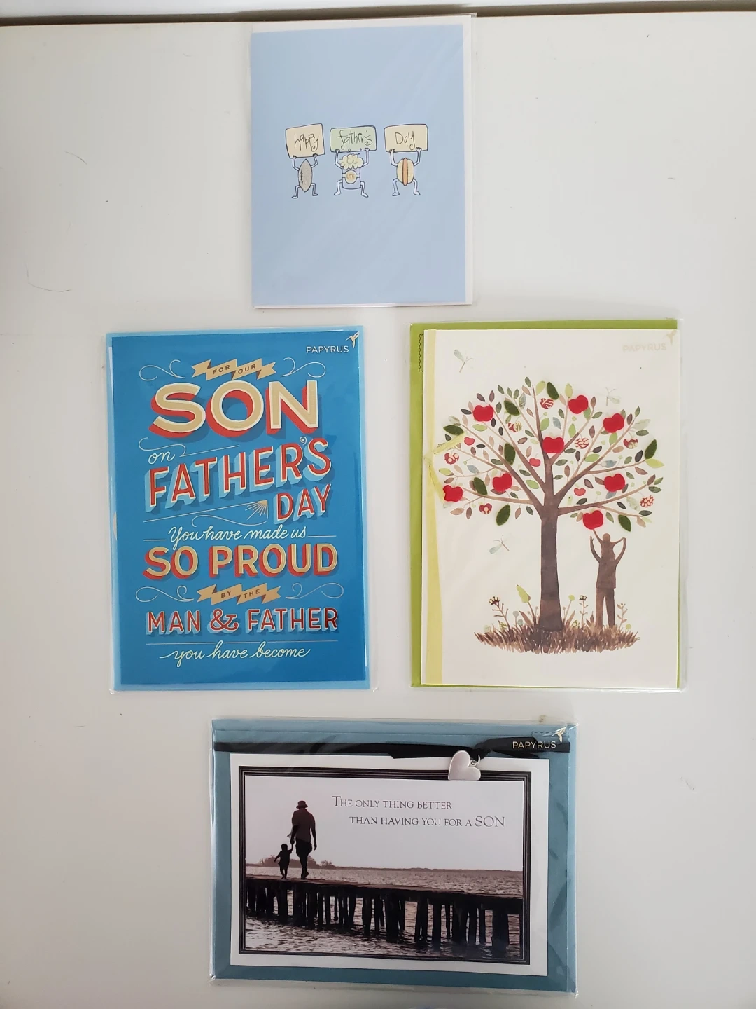 A collection of four Father's Day cards, featuring designs from Papyrus and Jenny Sweeney. Includes cards for sons and general Father's Day greetings. Cards come with envelopes.