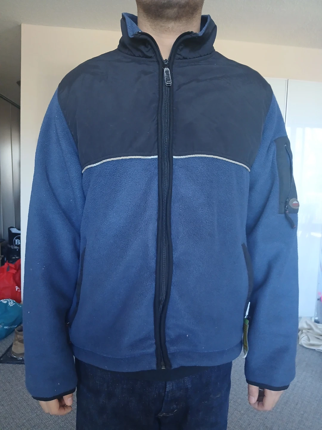 Men's blue and black fleece jacket with a zip-up front and a chest pocket. It's made of soft fleece material. This jacket is great for staying warm on chilly days!