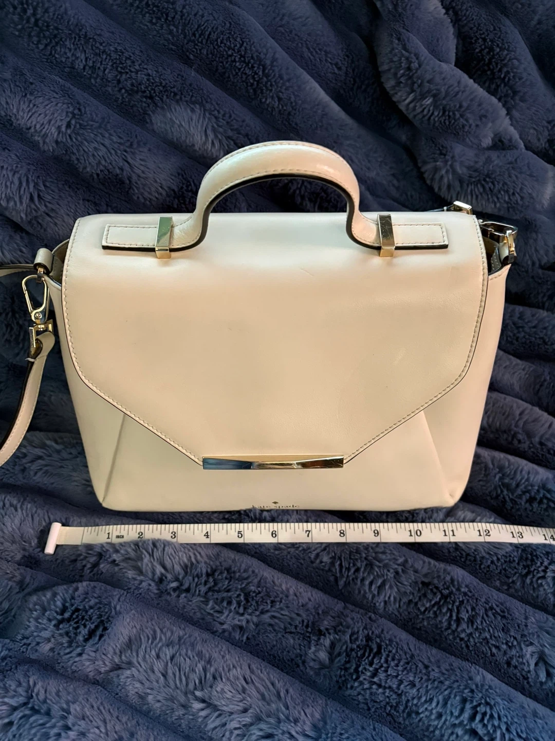This is a cream leather satchel handbag from Kate Spade. It has a structured design with gold-tone hardware and a removable crossbody strap. The interior features multiple pockets for organization.