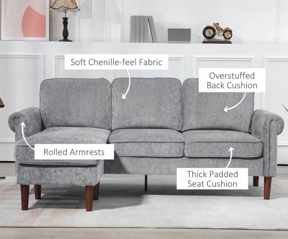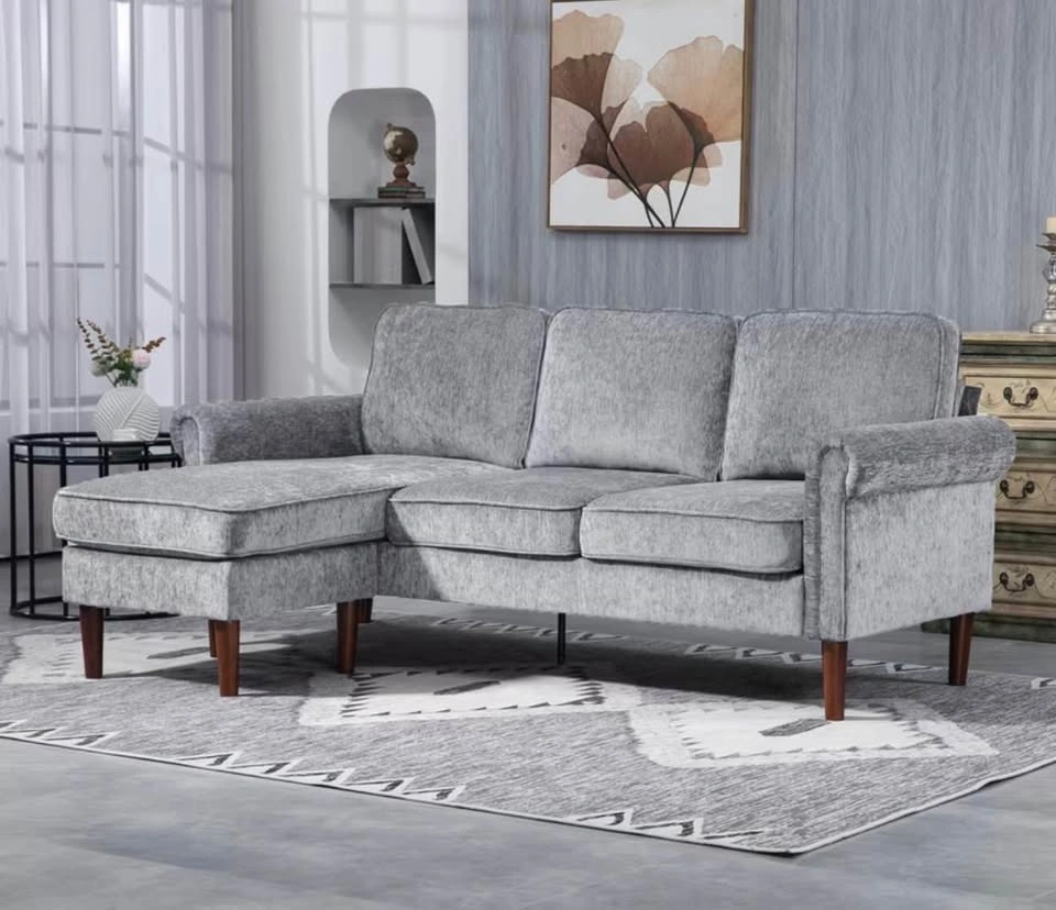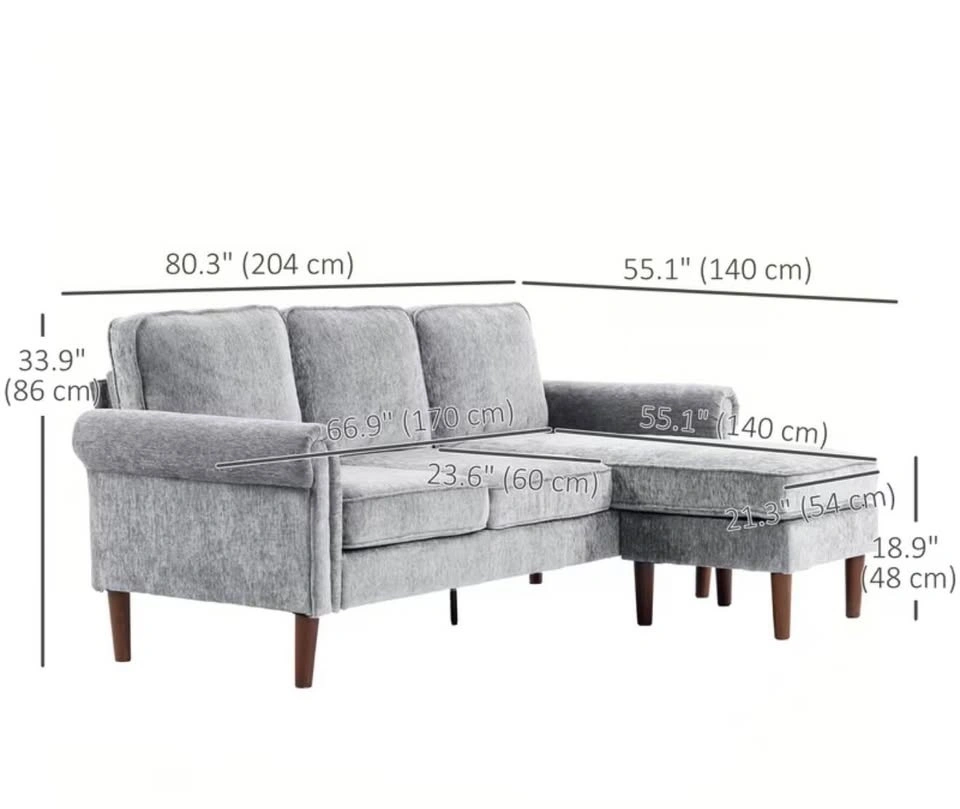 Brand New In Box reversible chaise lounge sofa with soft chenille-feel fabric, overstuffed back cushions, rolled armrests, and thick padded seat cushions. The chaise can be configured on either the left or right side. Overall dimensions are 80.3" wide and 55.1" deep. Pick up only. Cash or e-transfer accepted.