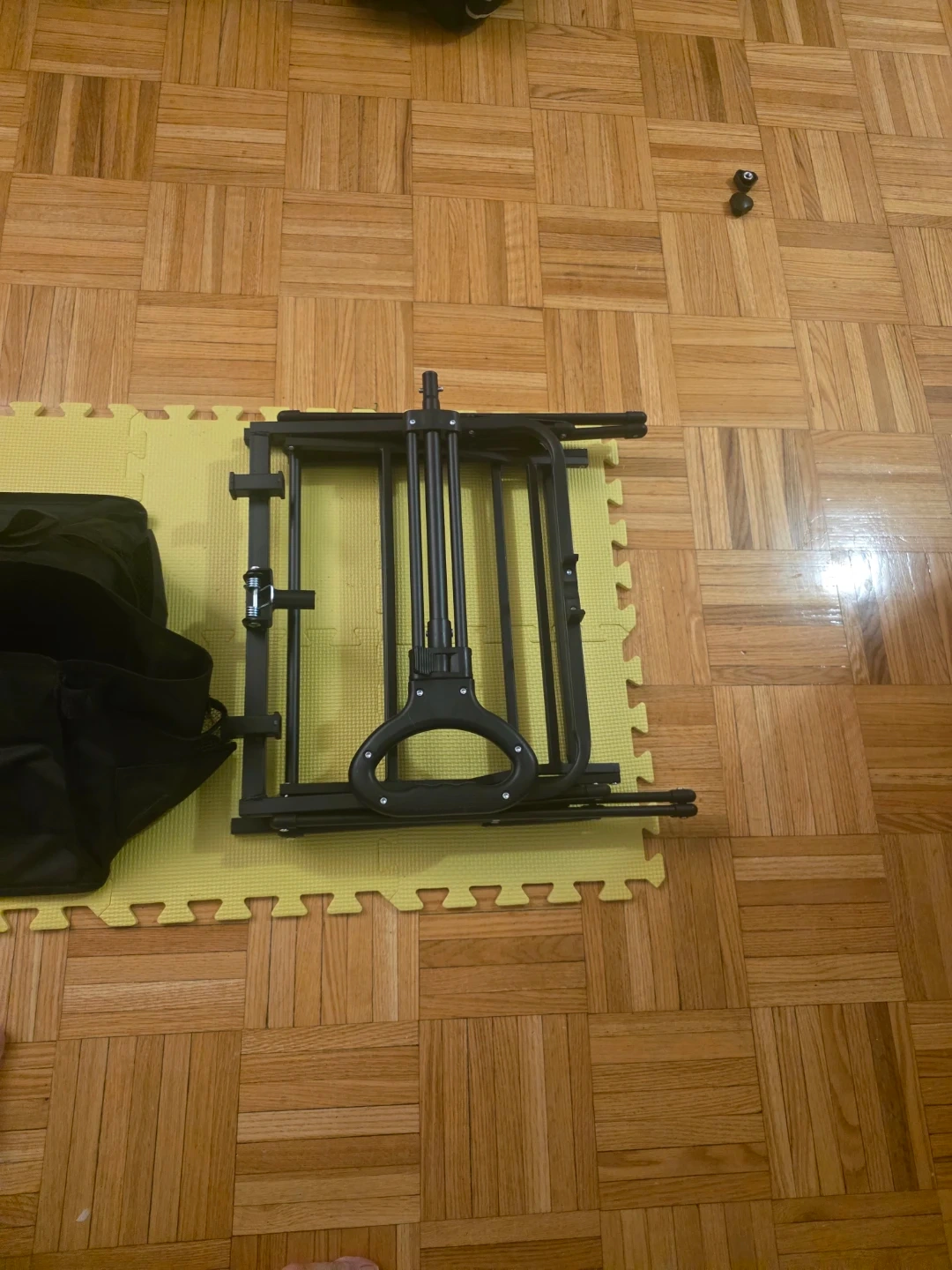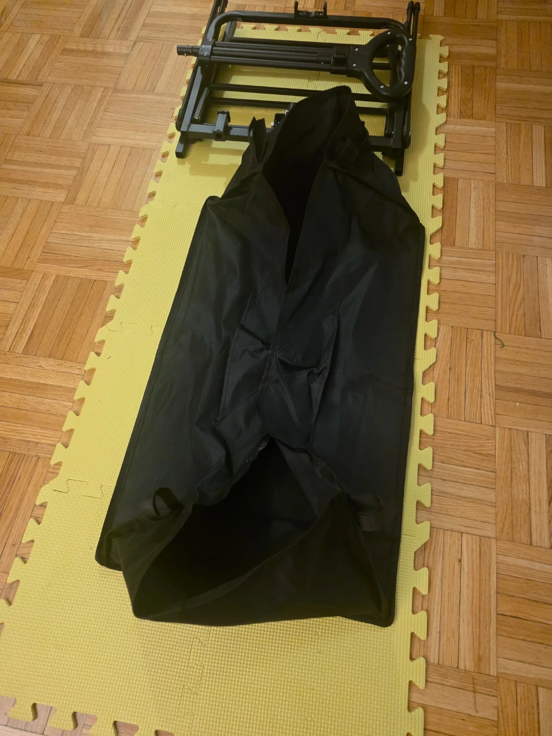 This is a black folding outdoor wagon cart. It comes with wheels and a storage bag. It's designed for easy transport of gear to the beach or park. The frame is made of durable metal.