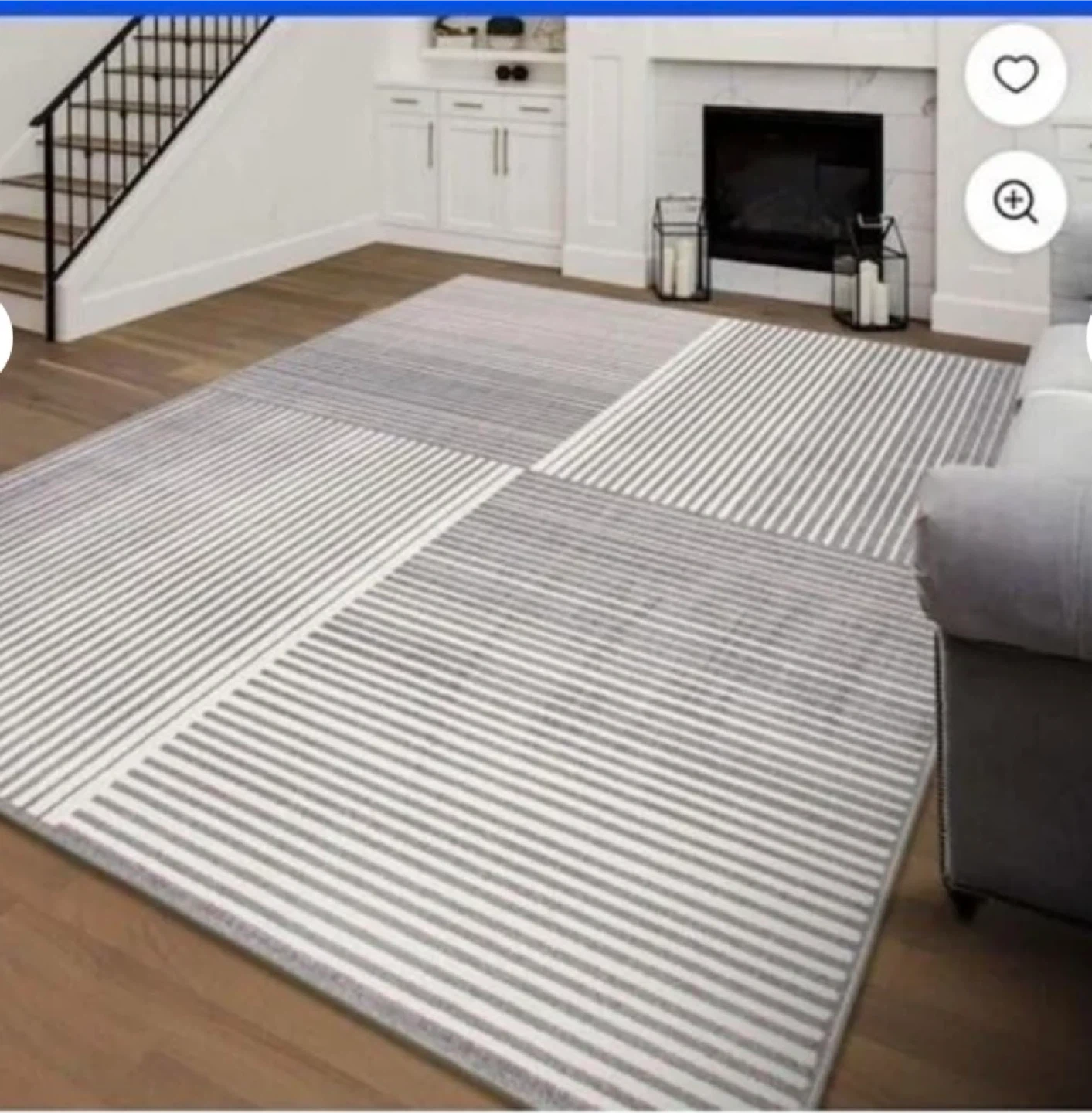 Grey and white geometric patterned area rug. Material appears to be synthetic. Adds a modern touch to any room. Comes rolled for easy transport.