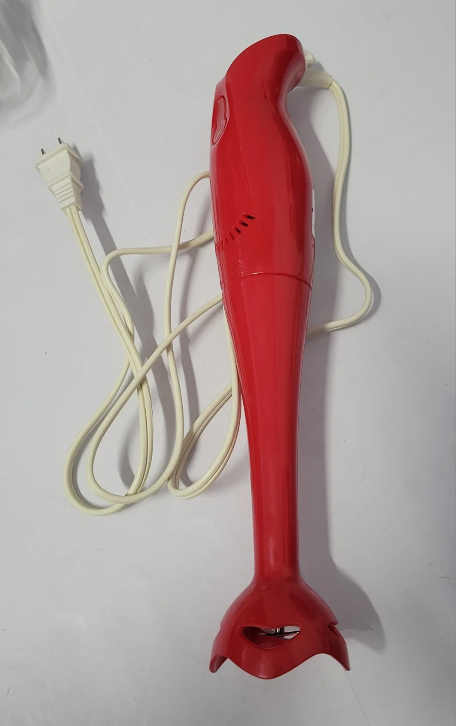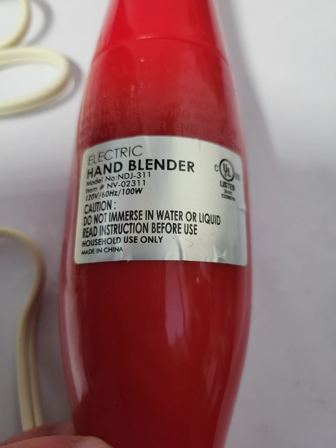 This is a red electric hand blender. It's a model NDJ-311 and uses 120V/60Hz/100W. Designed for household use only. Works great.